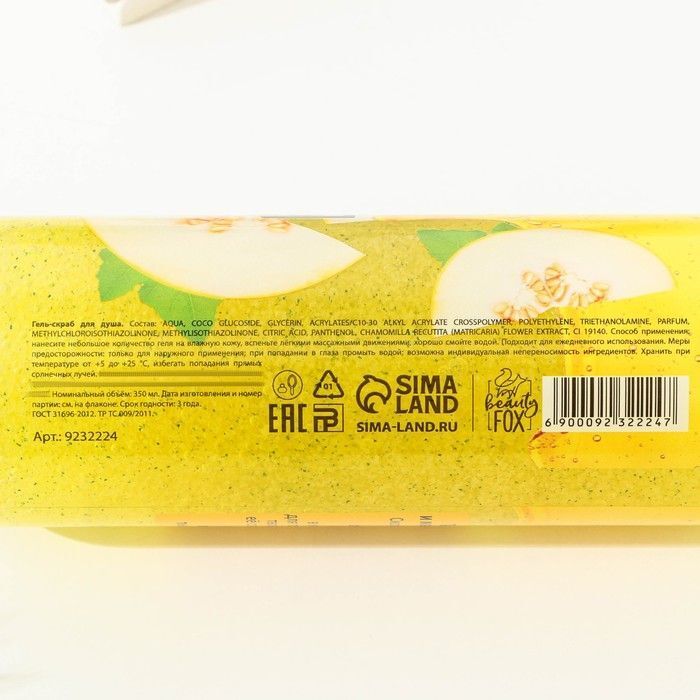 Гель-скраб представлен в удобной пластиковой бутылке с черной крышкой, что делает его использование простым и комфортным. Яркий желтый цвет геля с видимыми частичками создает визуально привлекательный образ, а также подчеркивает его натуральность. Продукт произведен в России под маркой Beauty Fox, что гарантирует высокое качество и безопасность.