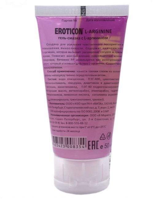 Объем тубы составляет 50 мл, что делает ее удобной для хранения и использования. Упаковка выполнена в стильном фиолетовом цвете с яркими элементами, что добавляет эстетики. Храните гель при температуре от 0 до 25°C и используйте в течение 24 месяцев после открытия. Не упустите возможность сделать ваши интимные моменты более насыщенными и запоминающимися с гелем-смазкой EROTICON L-Arginine!