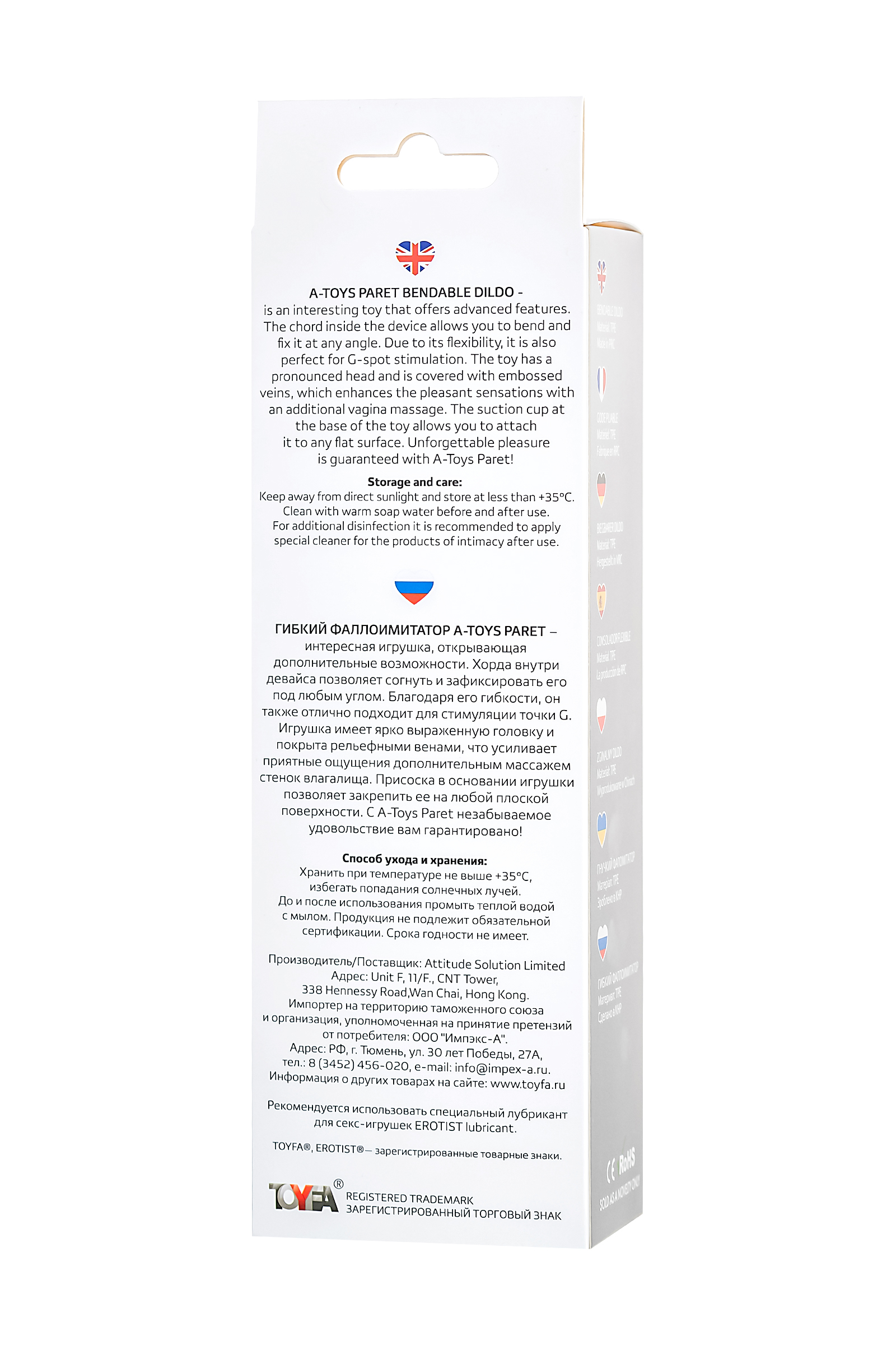 Фаллоимитатор A-toys Paret создан для тех, кто хочет управлять глубиной и углом проникновения, подстраивая игрушку под свои желания. Благодаря внутреннему гнущемуся стержню вы можете зафиксировать форму под любым удобным углом, усиливая стимуляцию и открывая новые сценарии удовольствия.