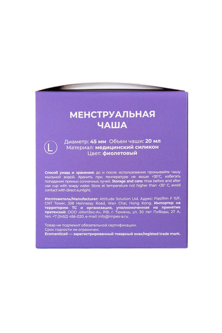 Менструальная чаша имеет диаметр 45 мм и объем 20 мл, что делает ее идеальной для женщин с нормальным уровнем выделений. Фиолетовый цвет и гладкая поверхность придают ей стильный вид. Чаша легко моется и может использоваться в течение нескольких лет при правильном уходе. Не забывайте прокипятить чашу после каждого цикла для обеспечения гигиеничности.