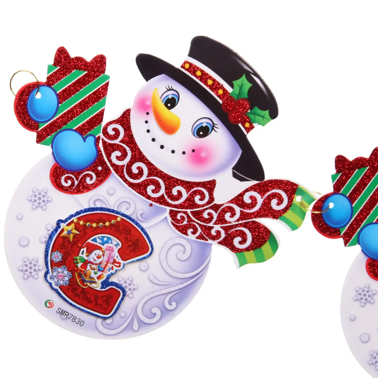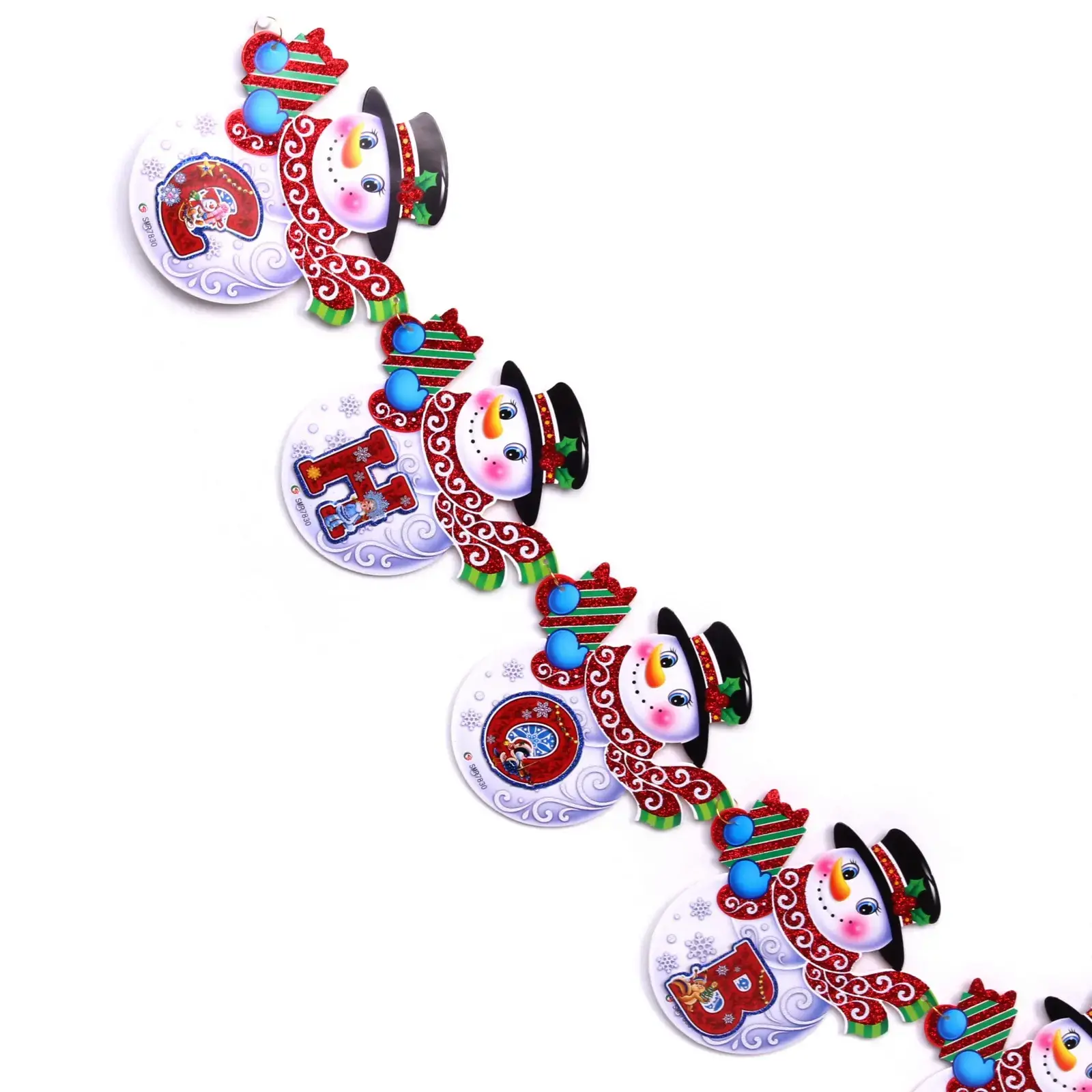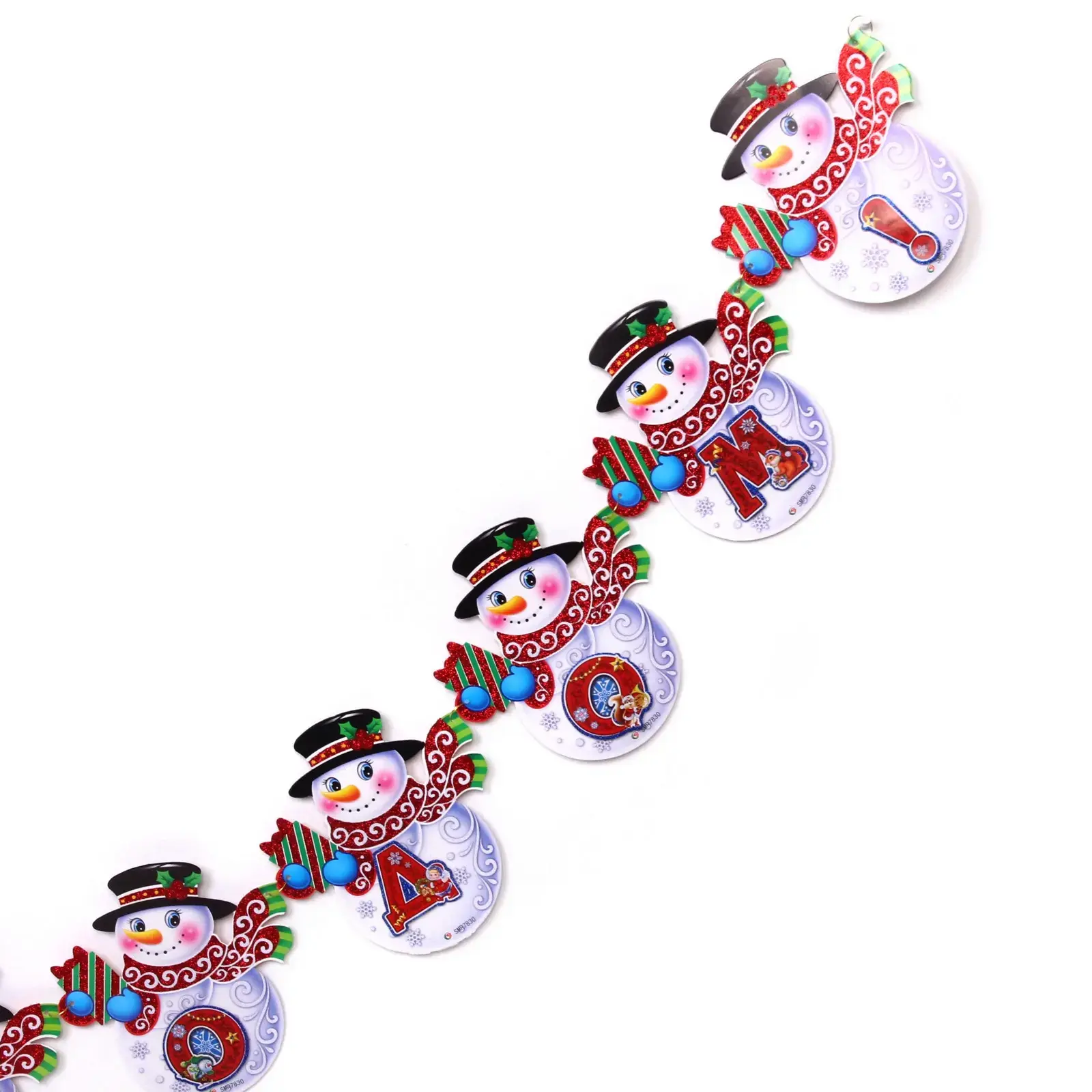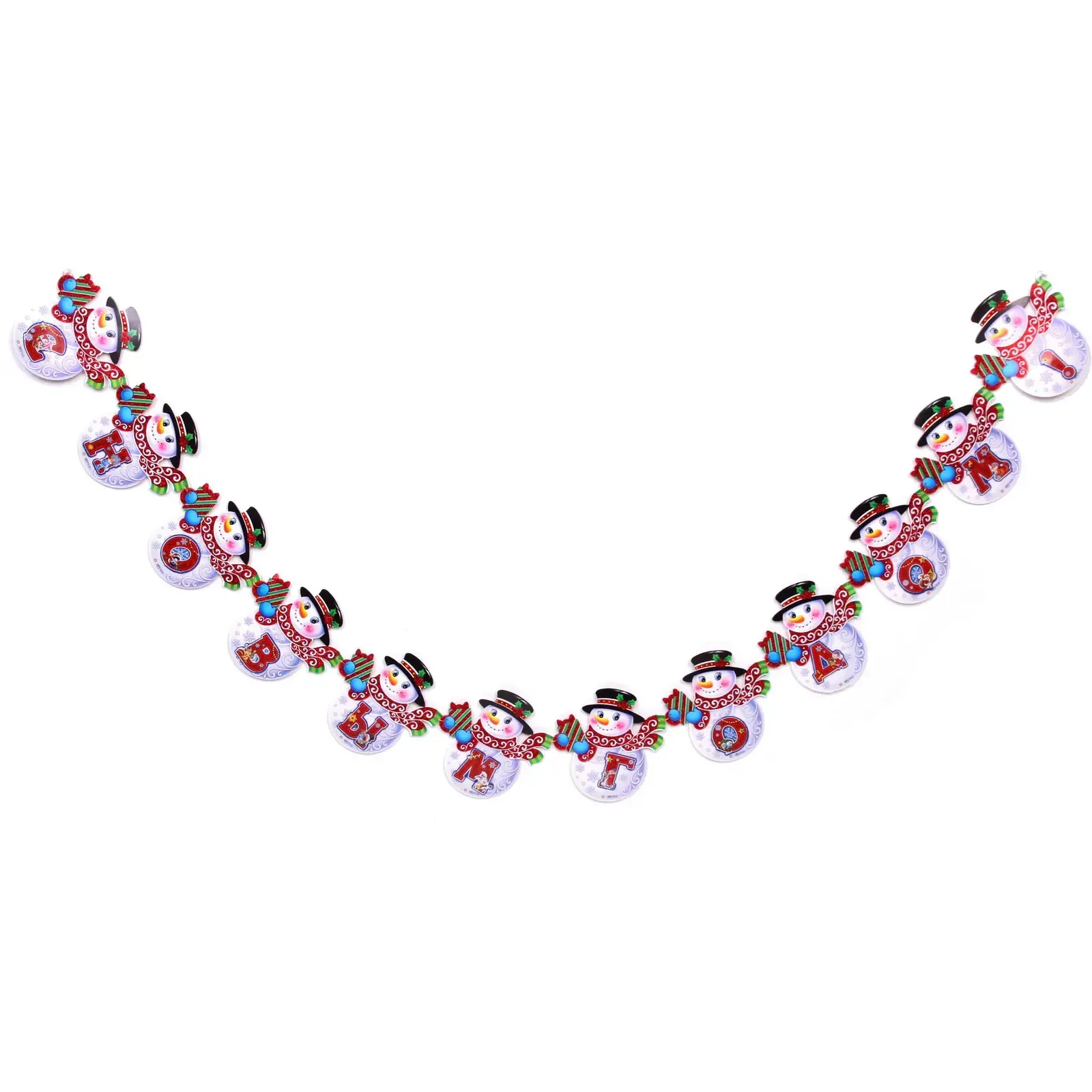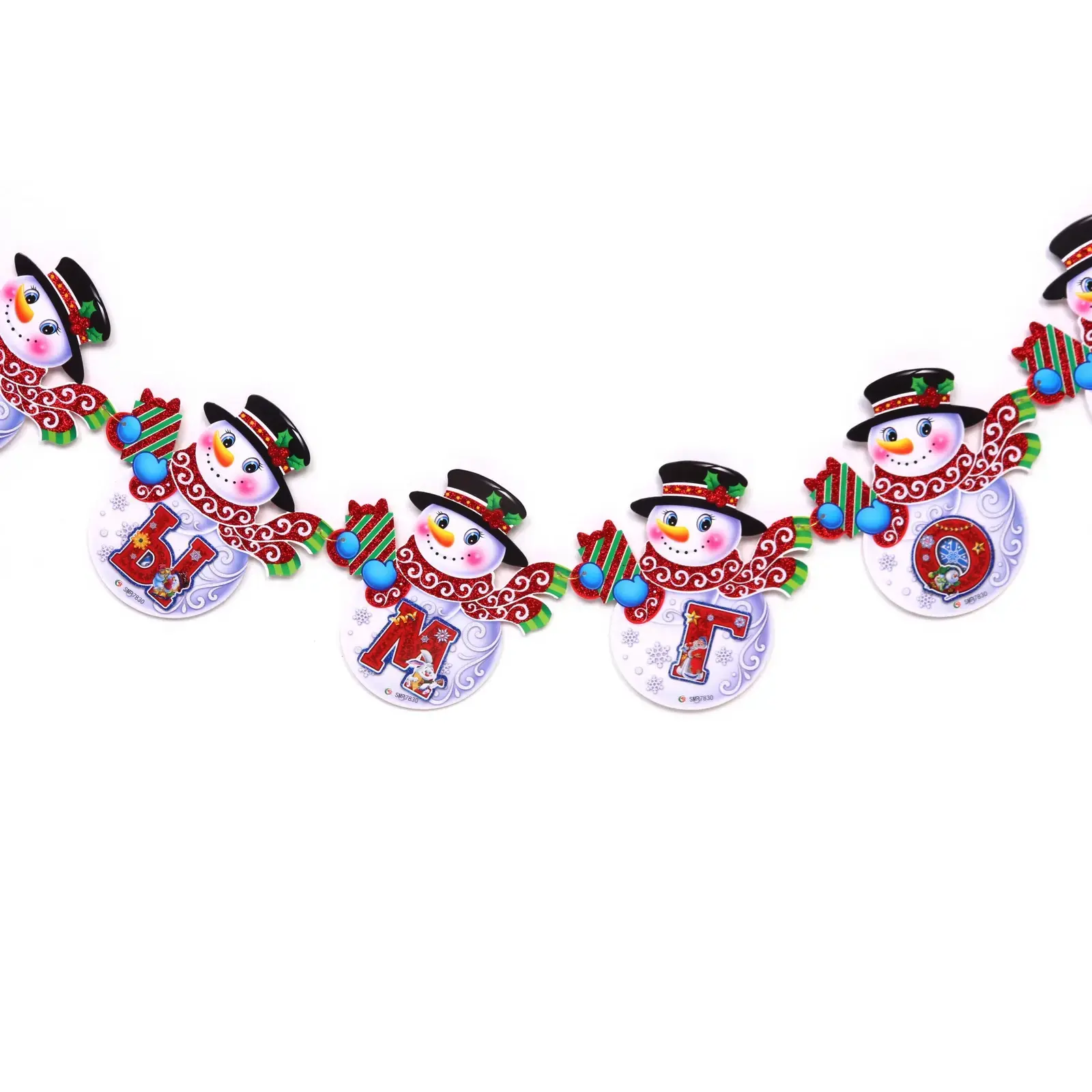Гирлянда выполнена из качественного картона и украшена веселыми снеговиками, которые не только радуют глаз, но и создают праздничное настроение. Каждый снеговик имеет уникальные детали, такие как яркие шарфы и шляпы, что делает гирлянду особенно привлекательной для детей и взрослых. Она легко крепится и может использоваться как внутри помещения, так и на улице, придавая вашему празднику особый шарм.