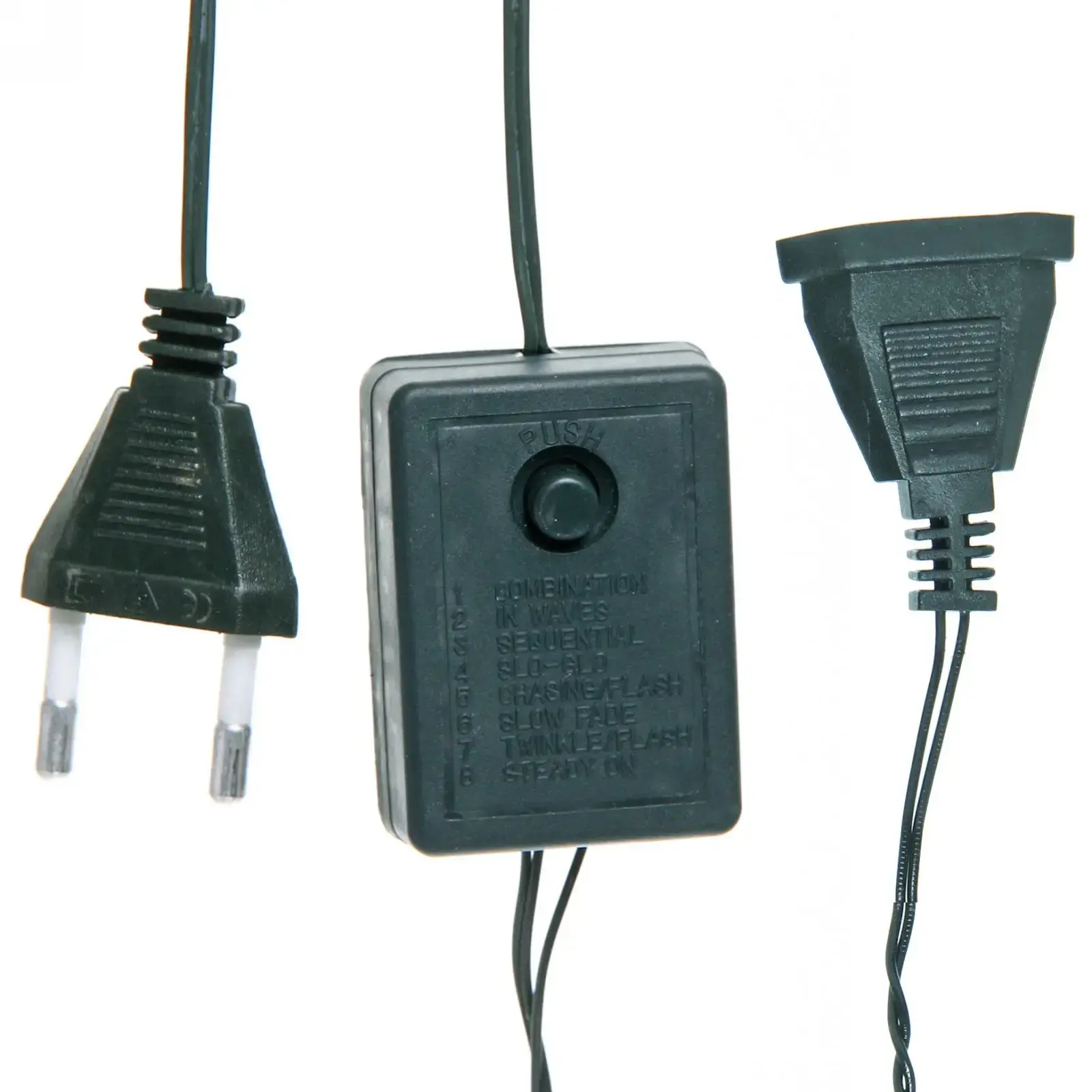 Темно-зеленый провод ПВХ практически незаметен на фоне. Встроенные 8 режимов работы позволяют настроить освещение под любое настроение и мероприятие. Возможность соединения нескольких гирлянд помогает оформить просторные помещения.
