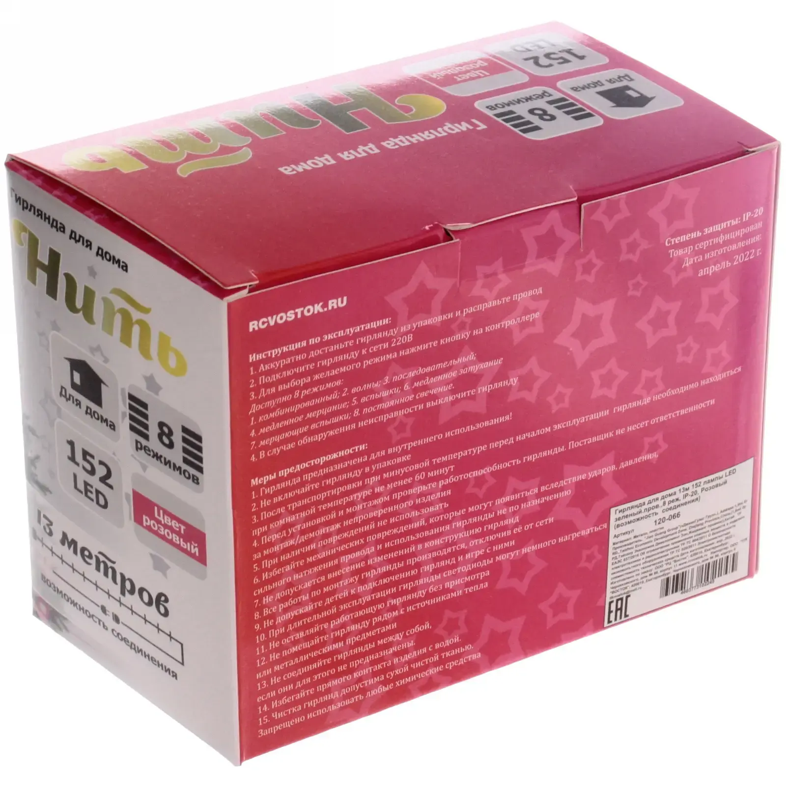 Гирлянда длиной 13 метров содержит 152 ярких LED-лампы. Степень защиты IP-20 гарантирует безопасную работу внутри помещений. Изготовлена из качественных материалов: металл и пластик.