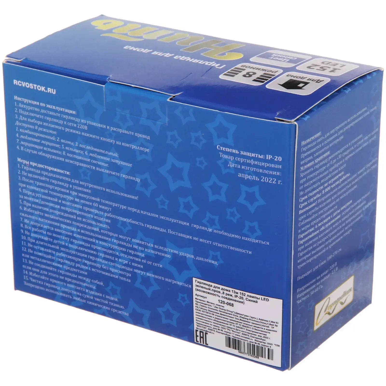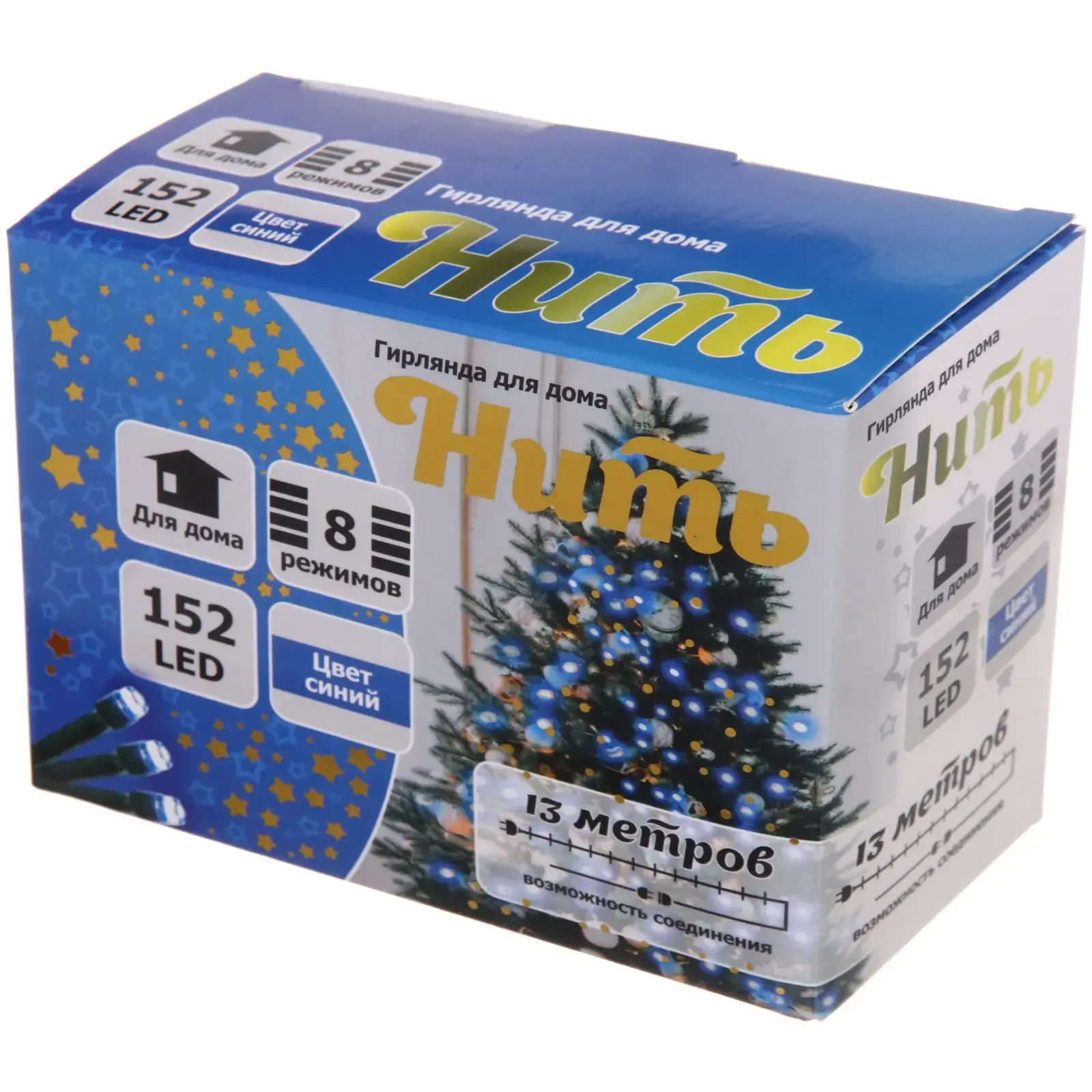 Длина гирлянды — 13 метров, количество LED-ламп — 152, цвет свечения — синий. Провод выполнен из ПВХ, устойчивого к механическим воздействиям, основа — металл и пластик. Устройство предназначено исключительно для эксплуатации внутри помещений.