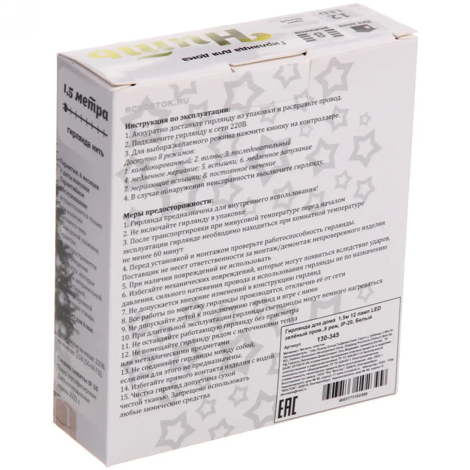 Гирлянда для дома 1,5м 12 ламп LED зелёный пров.,8 реж, IP-20, Белый