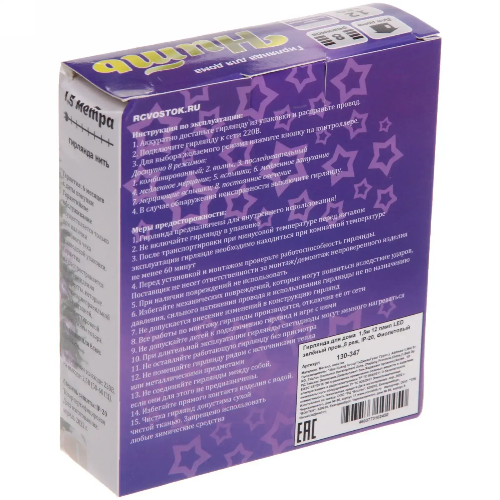 Длина гирлянды — 1,5 м с равномерным распределением ламп через каждые 12,5 см. Степень защиты IP20 гарантирует безопасность использования в закрытых помещениях. Компактные размеры светодиодов (Ø8 мм) и гибкий провод позволяют создавать сложные декоративные композиции.