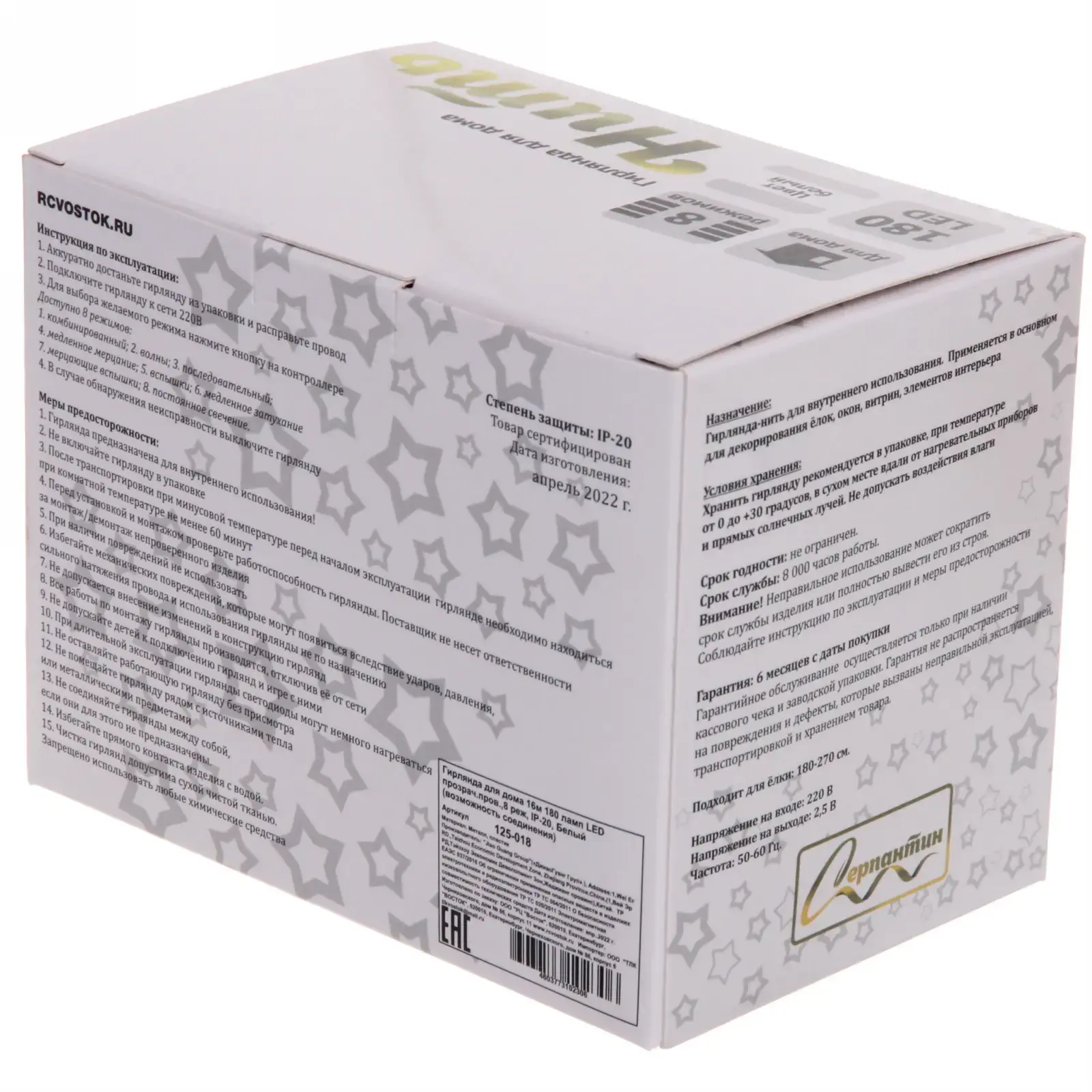 Гирлянда работает в теплых помещениях, оснащена 8 режимами работы, что дает варианты оформления в соответствии с любой атмосферой праздника или интерьера. Материалы — металл, пластик, что гарантирует долговечность и надежность использованных элементов.