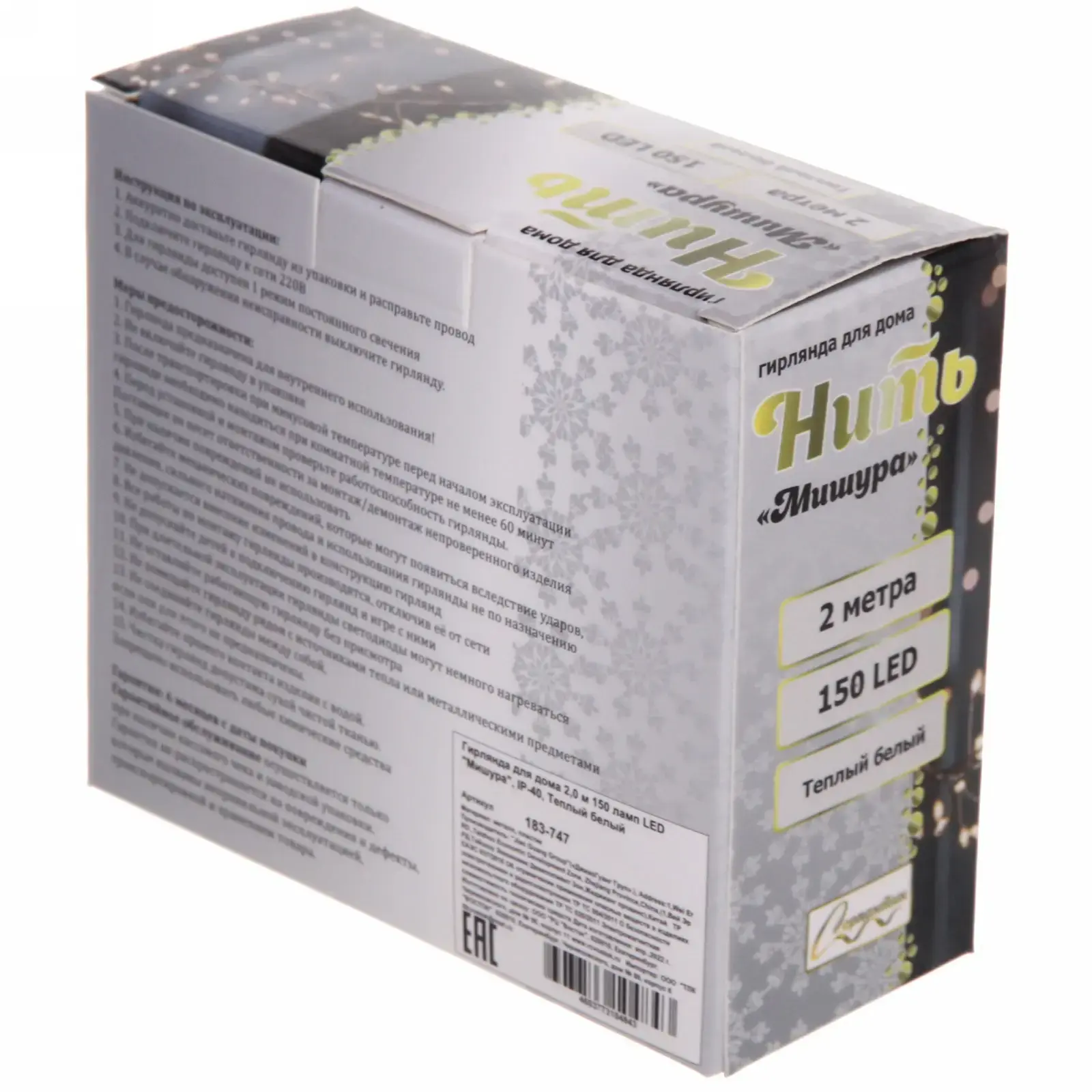 Гирлянда выполнена из качественных материалов: металл и пластик, что обеспечивает ее надежность и долговечность. Длина гирлянды составляет 2 метра, а количество ламп — 150, что позволяет равномерно освещать большие пространства. Цвет свечения — теплый белый, который идеально подходит для создания уютной атмосферы. Гирлянда также имеет адаптер для подключения к электросети, что делает ее использование простым и удобным.