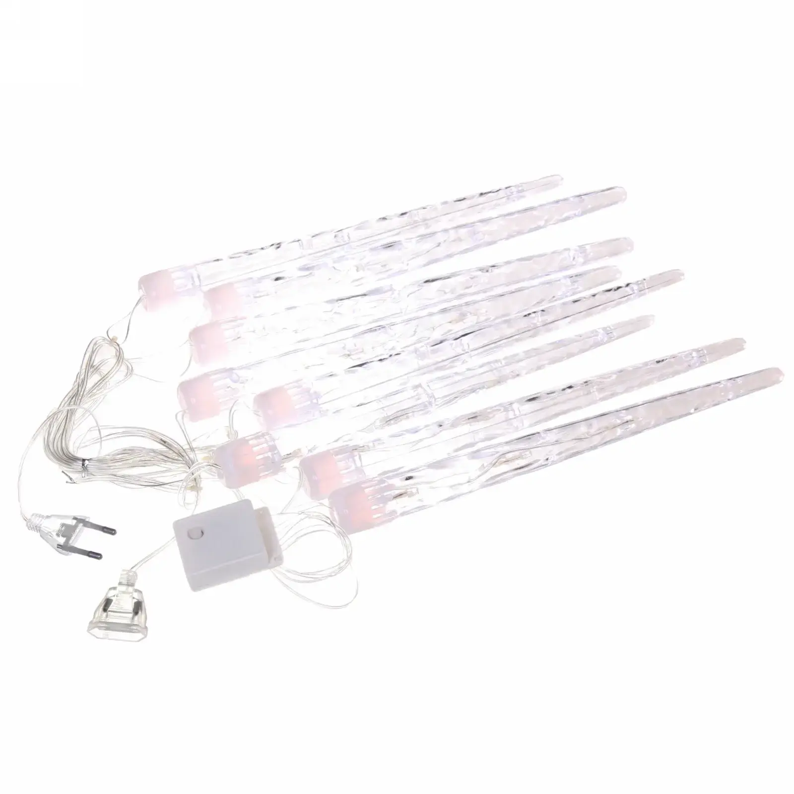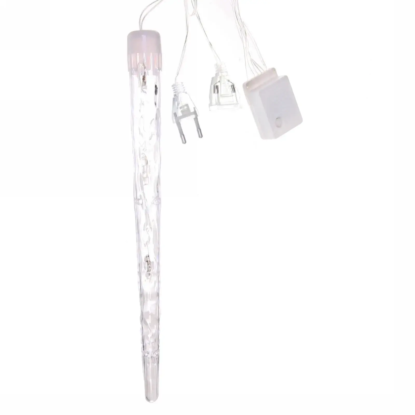 24 LED-лампы холодного белого свечения заключены в прозрачные пластиковые сосульки длиной 20 см. Гибкая проволока в металлической оплётке позволяет создавать сложные формы и фиксировать элементы в нужном положении.