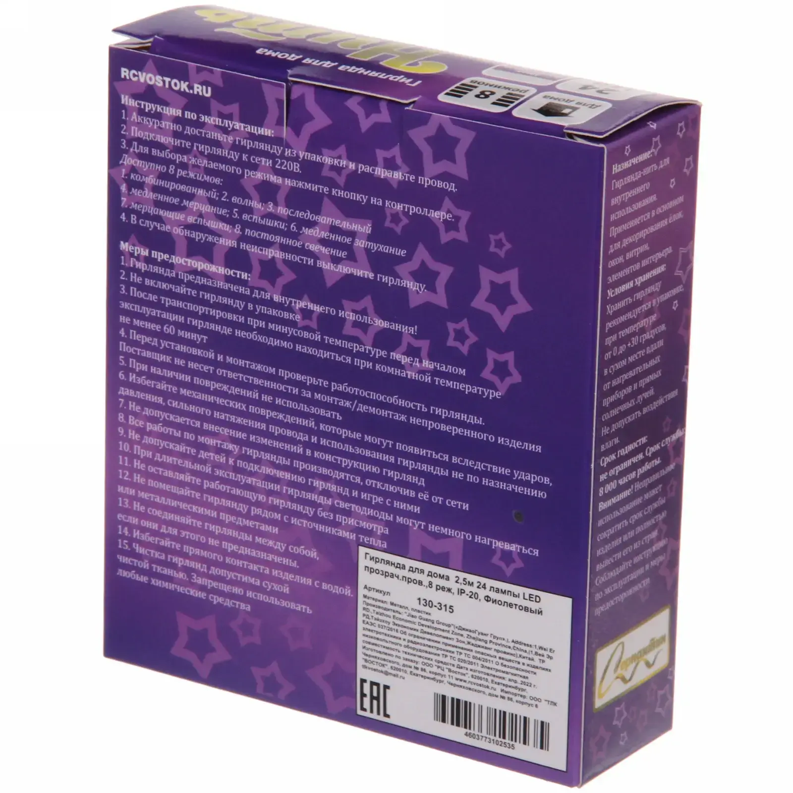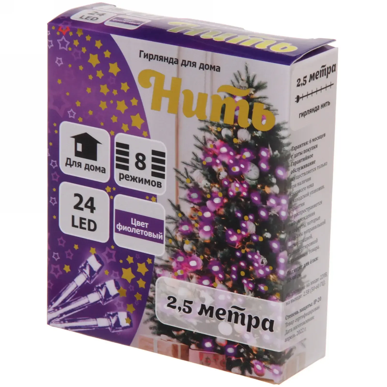 Фиолетовая LED-гирлянда с 8 динамическими режимами свечения превратит ваш дом в сказочное пространство. Прозрачный провод сливается со светлыми поверхностями, оставляя в фокусе только магическое сияние 24 энергоэффективных светодиодов.