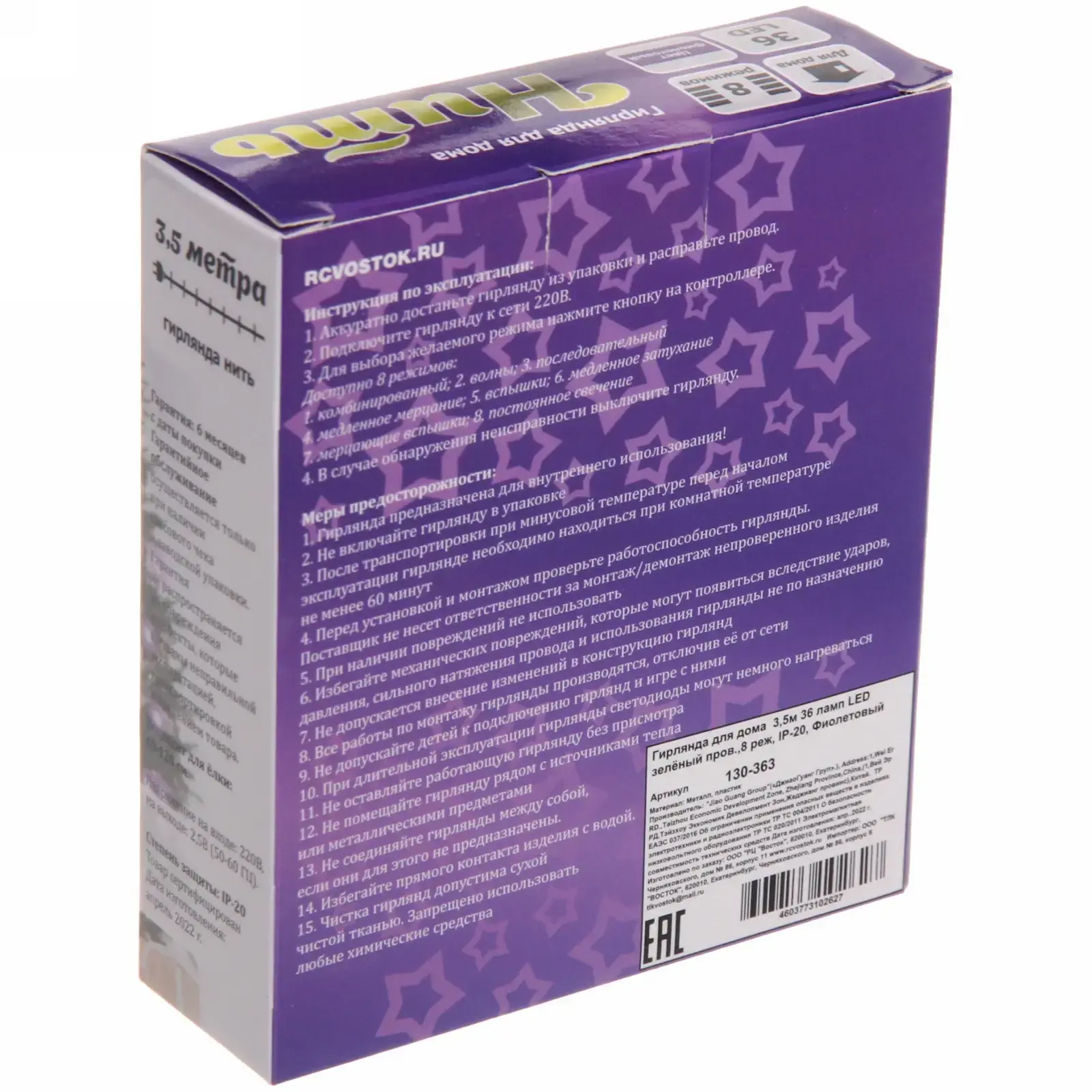 Гирлянда LED длиной 3,5 метра с 36 лампами фиолетового цвета — это идеальное решение для создания уютной и праздничной атмосферы в вашем доме. Она станет отличным дополнением к новогоднему декору, украсив елку, окна, двери и стены. Благодаря 8 режимам работы, вы сможете легко менять освещение в зависимости от настроения и события.