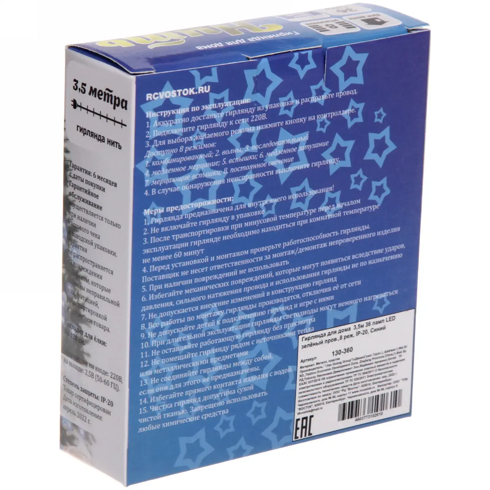 Длина гирлянды составляет 3,5 метра с равномерным расположением 36 ярких светодиодов. Провод выполнен из качественного ПВХ, устойчивого к механическим повреждениям. Световые элементы имеют компактную конструкцию, обеспечивающую равномерное свечение без раздражающего мигания.