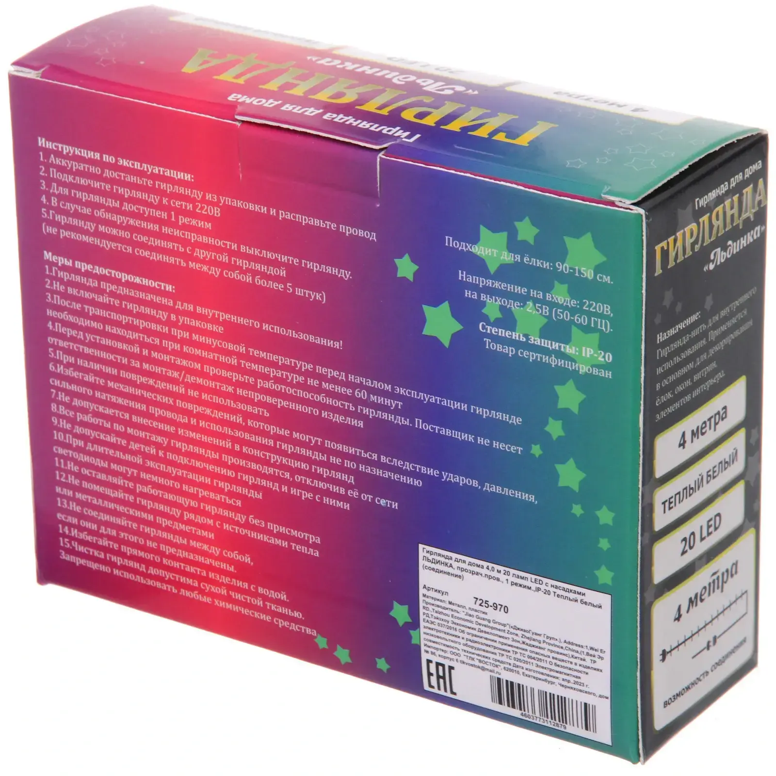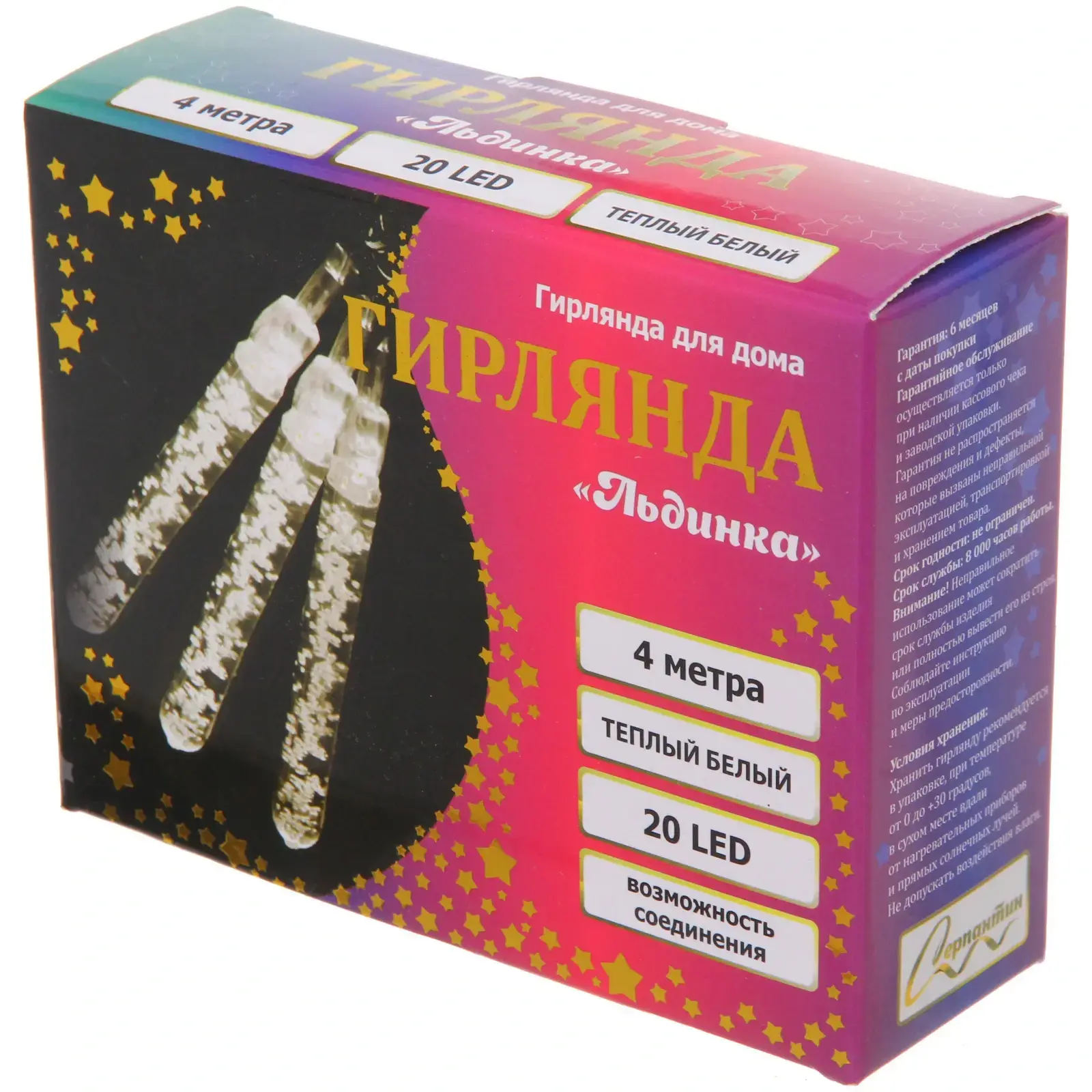 Гирлянда выполнена из качественных материалов: металл и пластик, что обеспечивает долговечность и надежность. Длина гирлянды составляет 4 метра, а количество ламп — 20. Она подходит для елок высотой от 90 до 150 см, что делает ее универсальным решением для любого праздника. Не упустите возможность создать уникальную атмосферу в вашем доме с гирляндой 'Льдинка'!