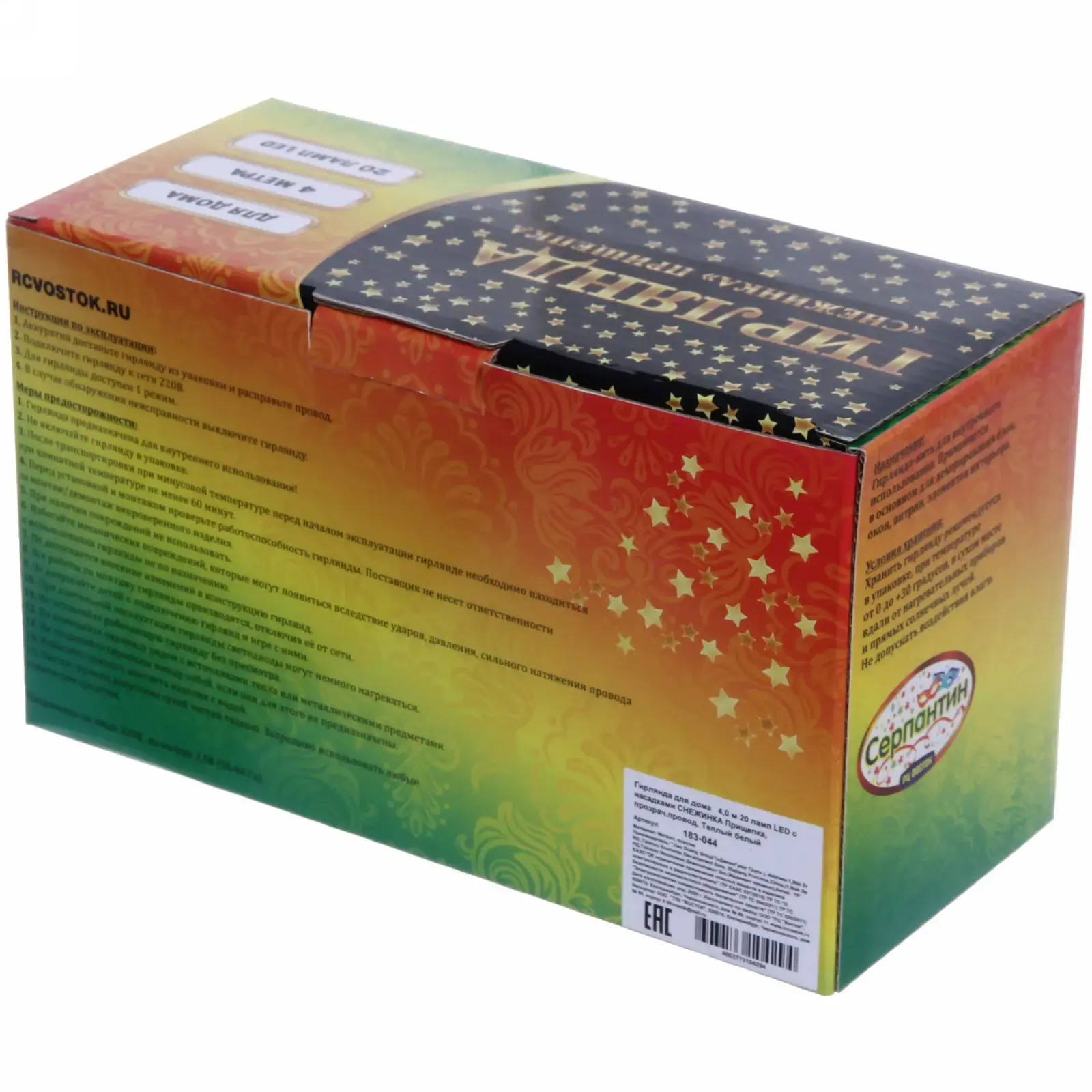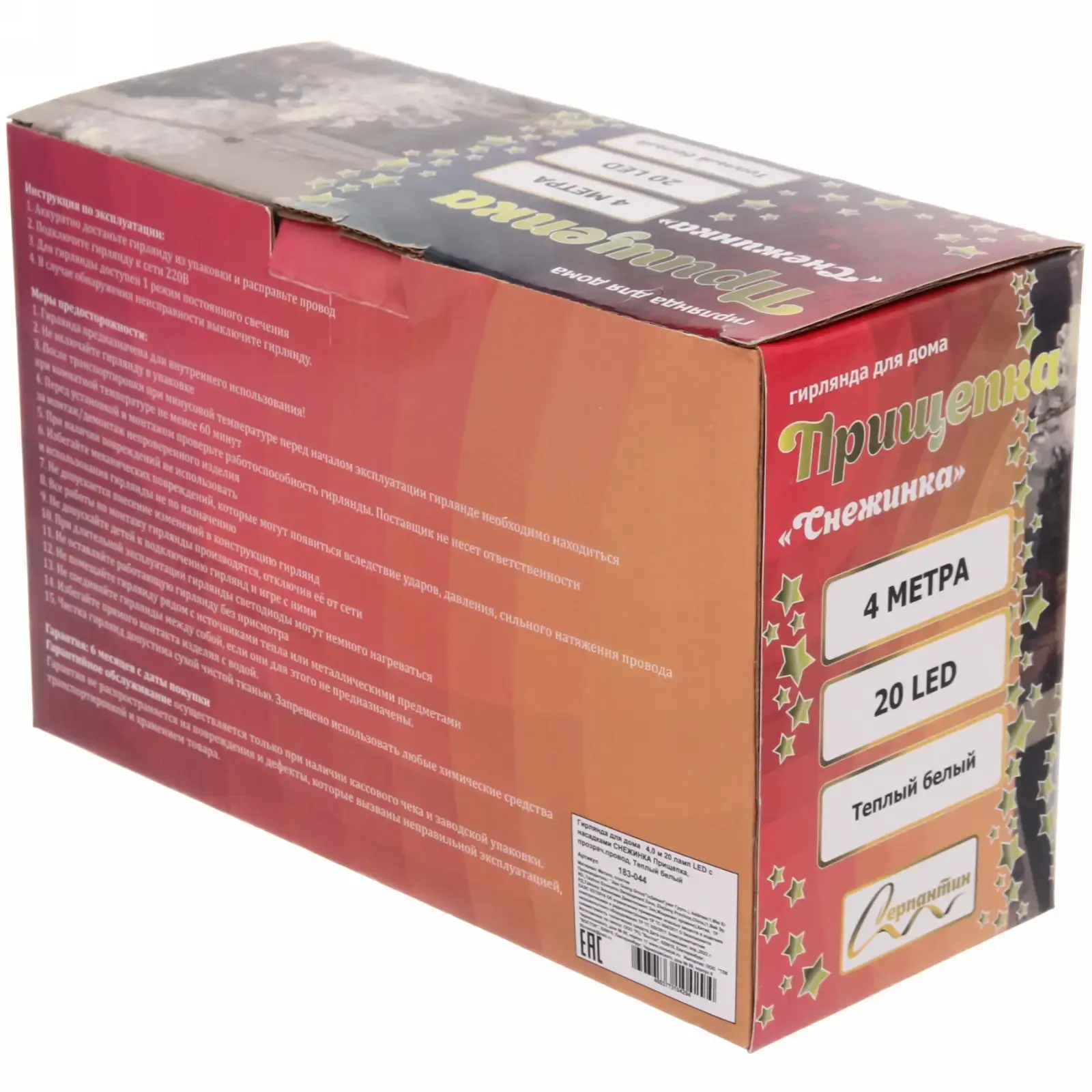 Гирлянда выполнена из качественных материалов, что гарантирует ее долговечность. Длина провода составляет 4 метра, а количество ламп — 20, что позволяет создать эффектное освещение на больших площадях. Теплый белый цвет света создает атмосферу уюта и спокойствия, идеально подходя для зимних праздников.