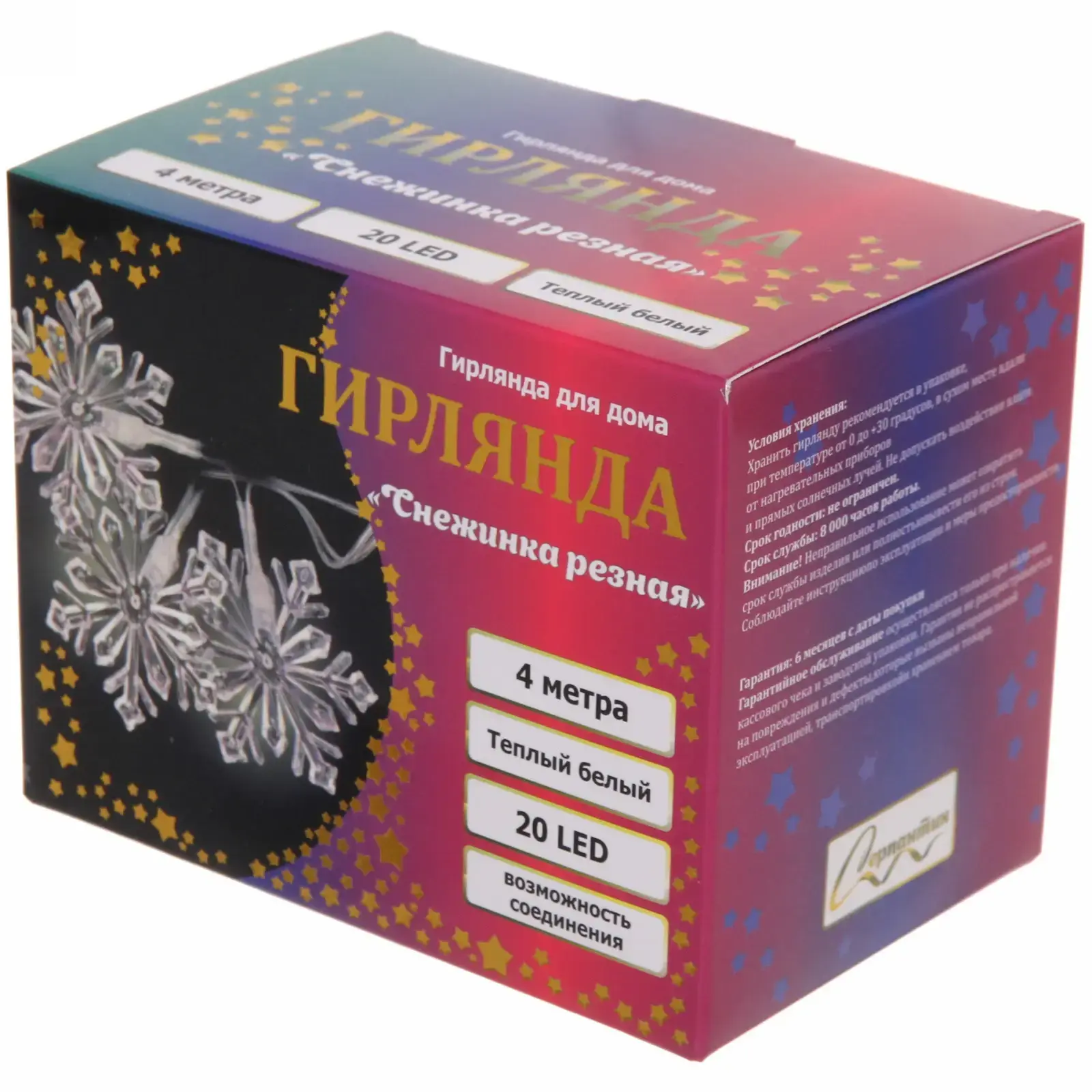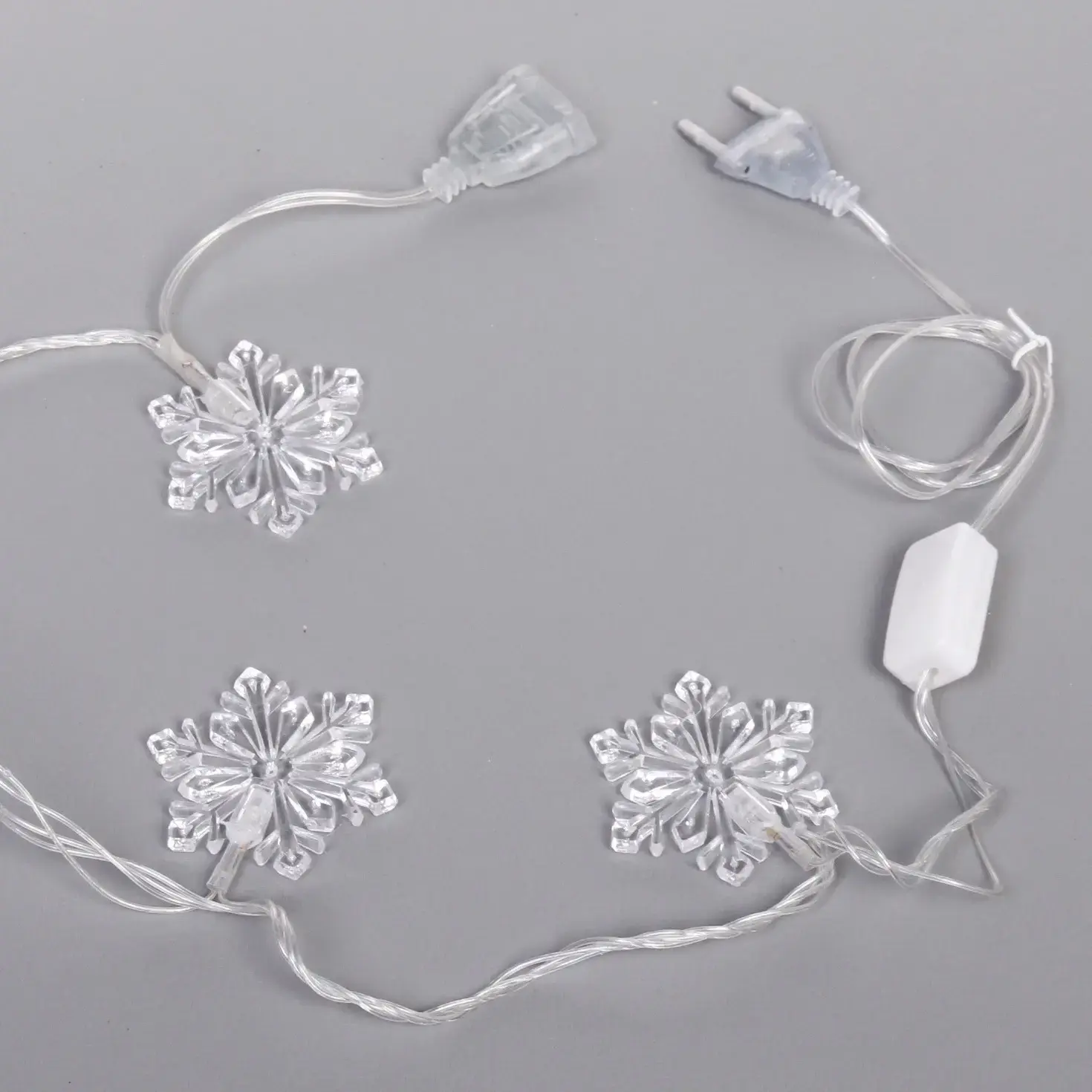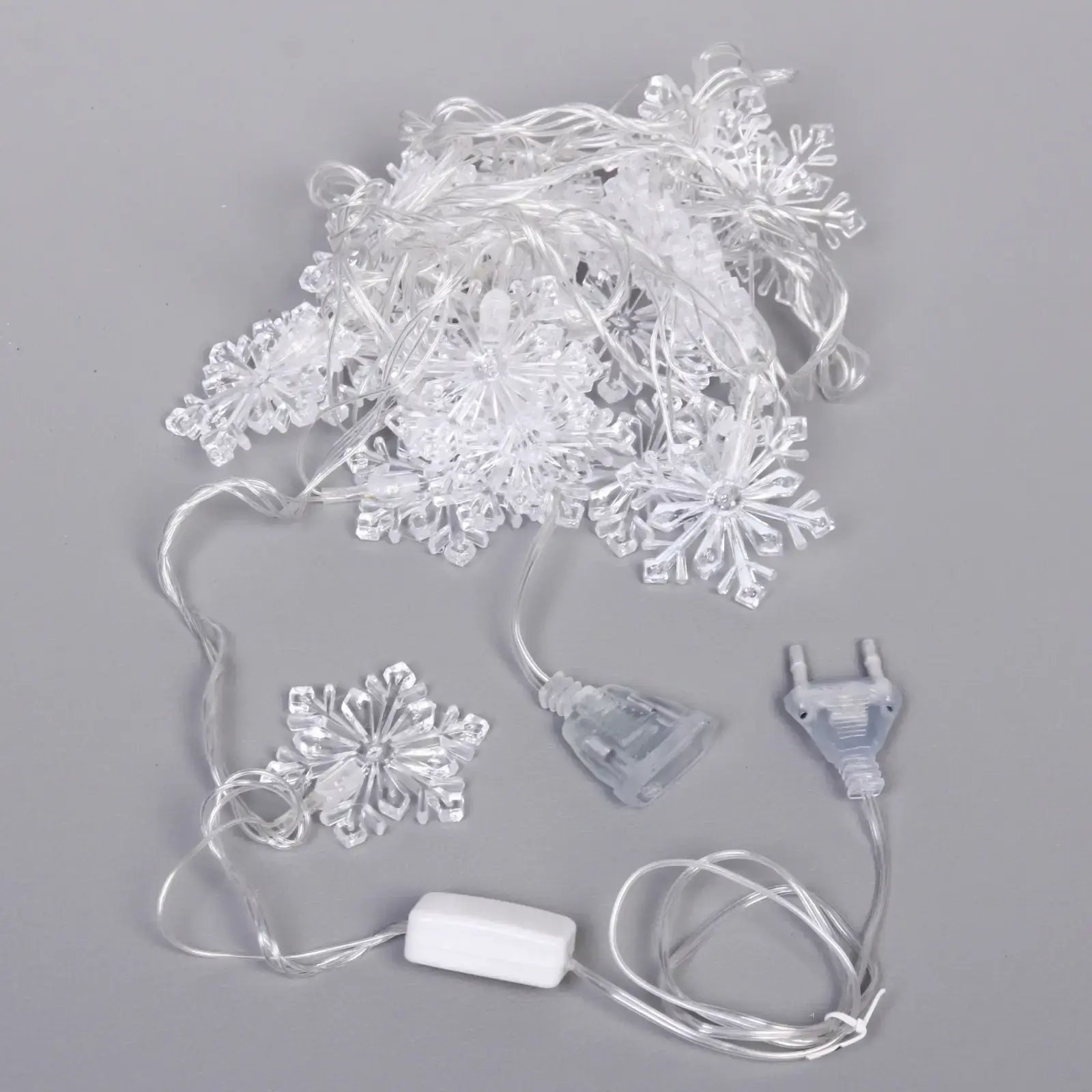 Компактные размеры снежинок (3-4 см) и равномерное расстояние между элементами создают гармоничную композицию. Сертифицированный товар соответствует требованиям электробезопасности — идеальный выбор для семей с детьми и домашними животными.