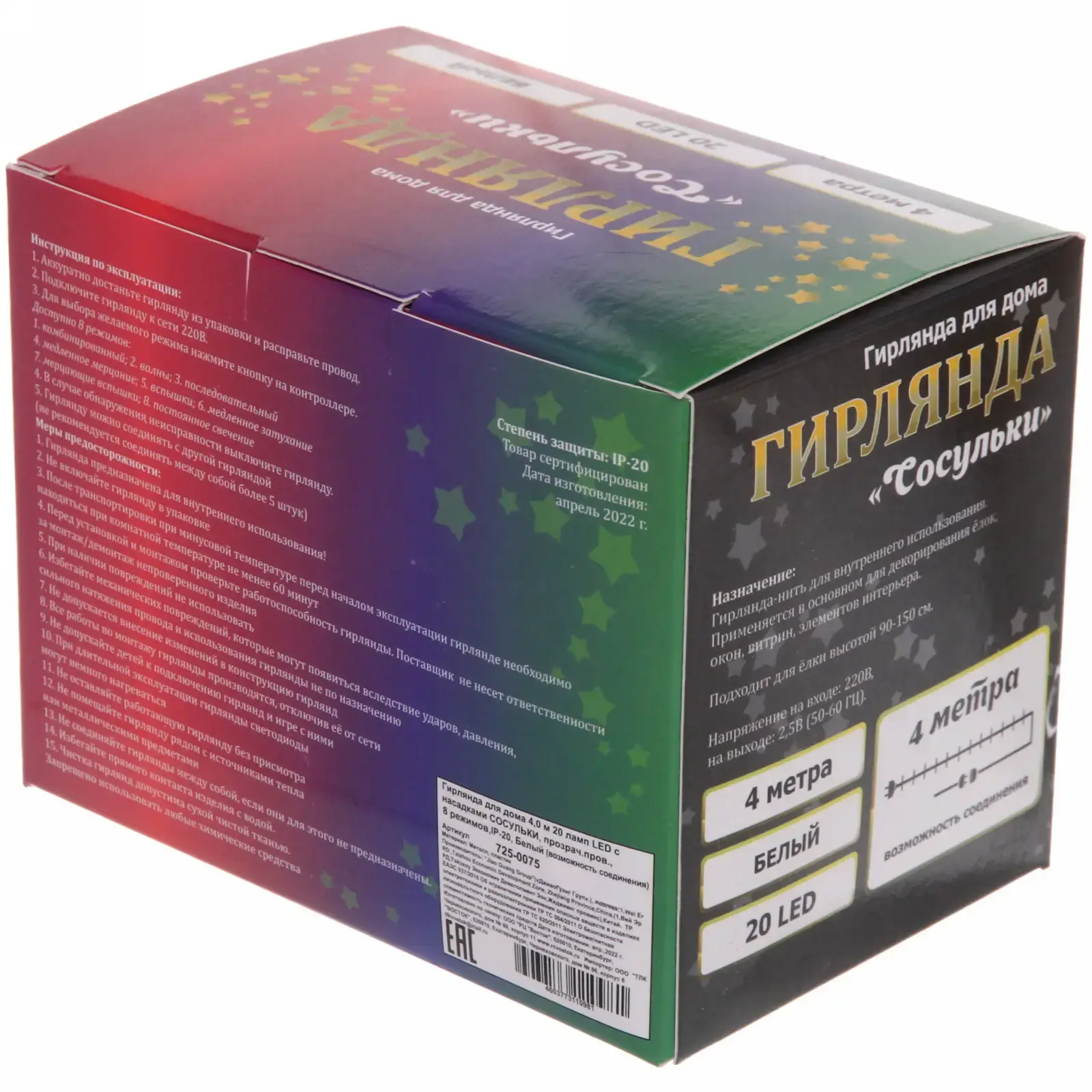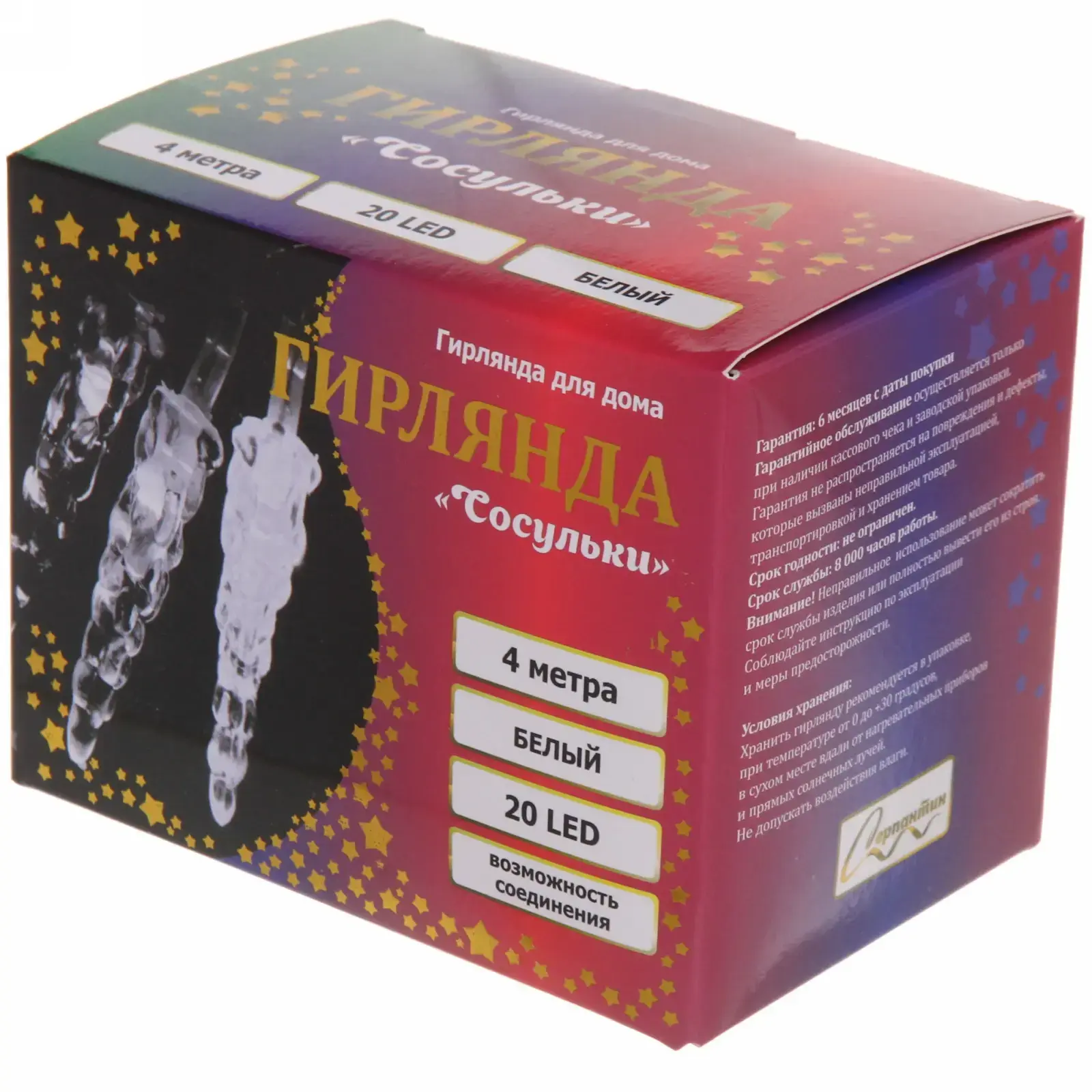 Гирлянда для дома 4,0 м 20 ламп LED с насадками СОСУЛЬКИ, прозрач.пров., 8 реж, IP-20, Белый (возможность соединения)