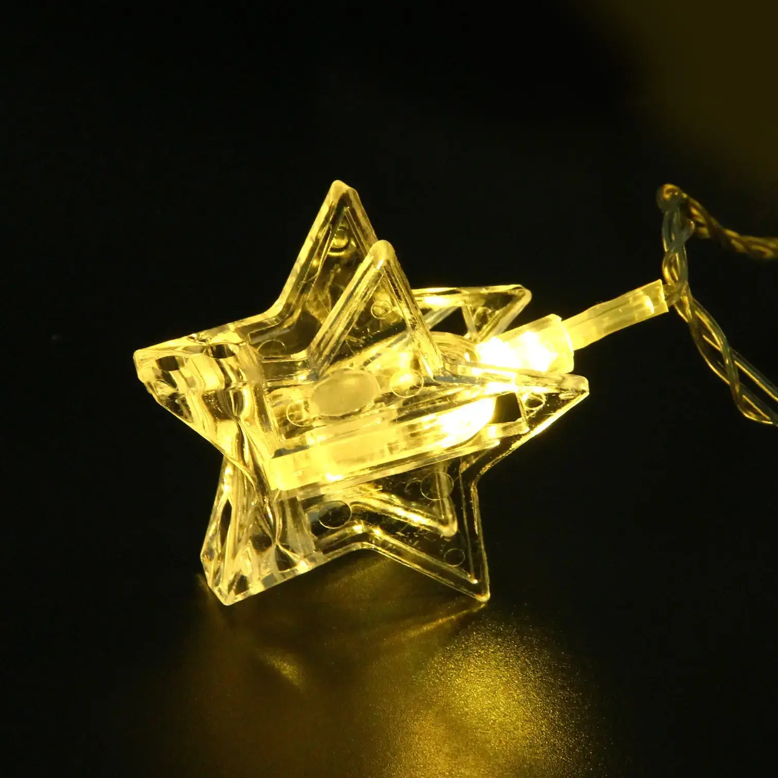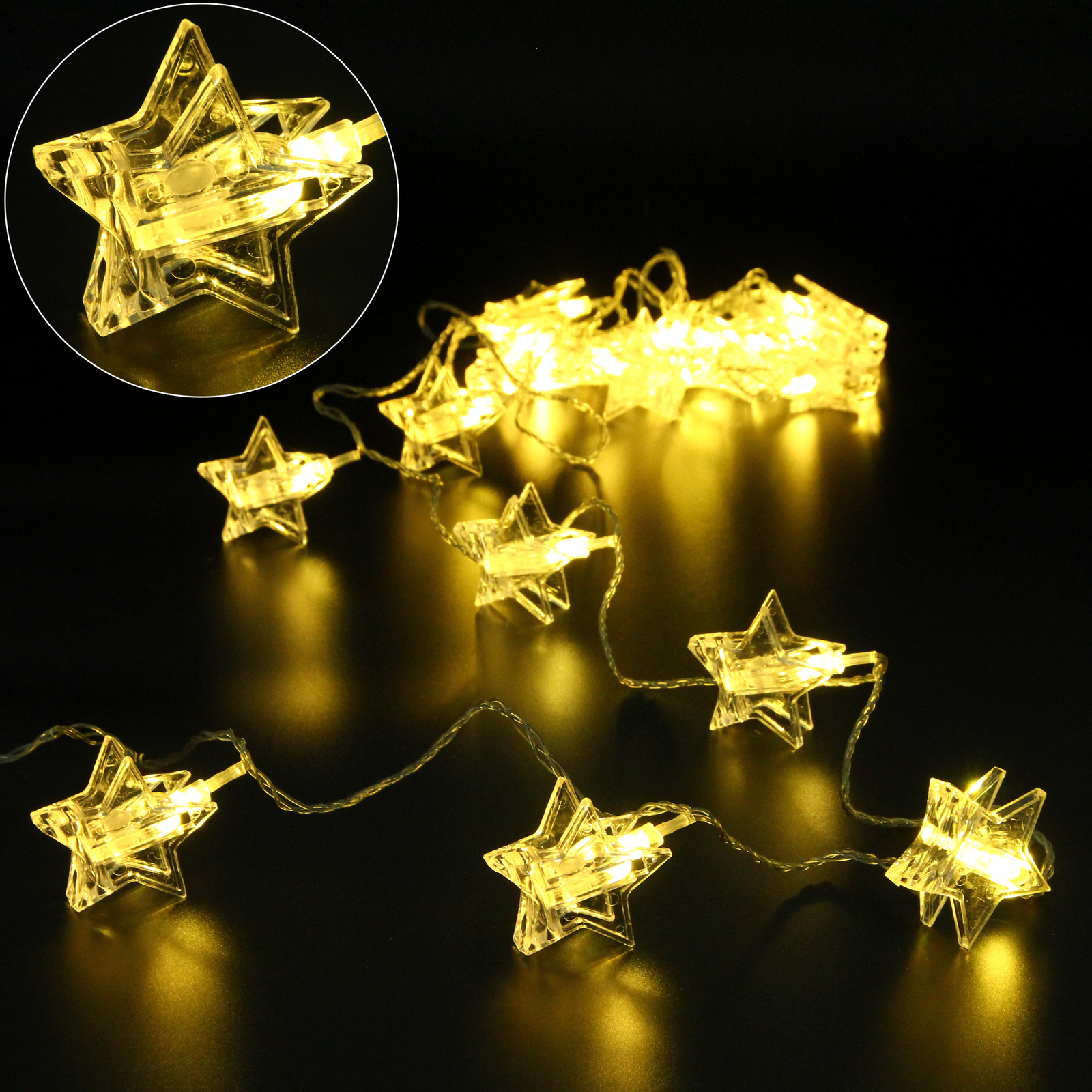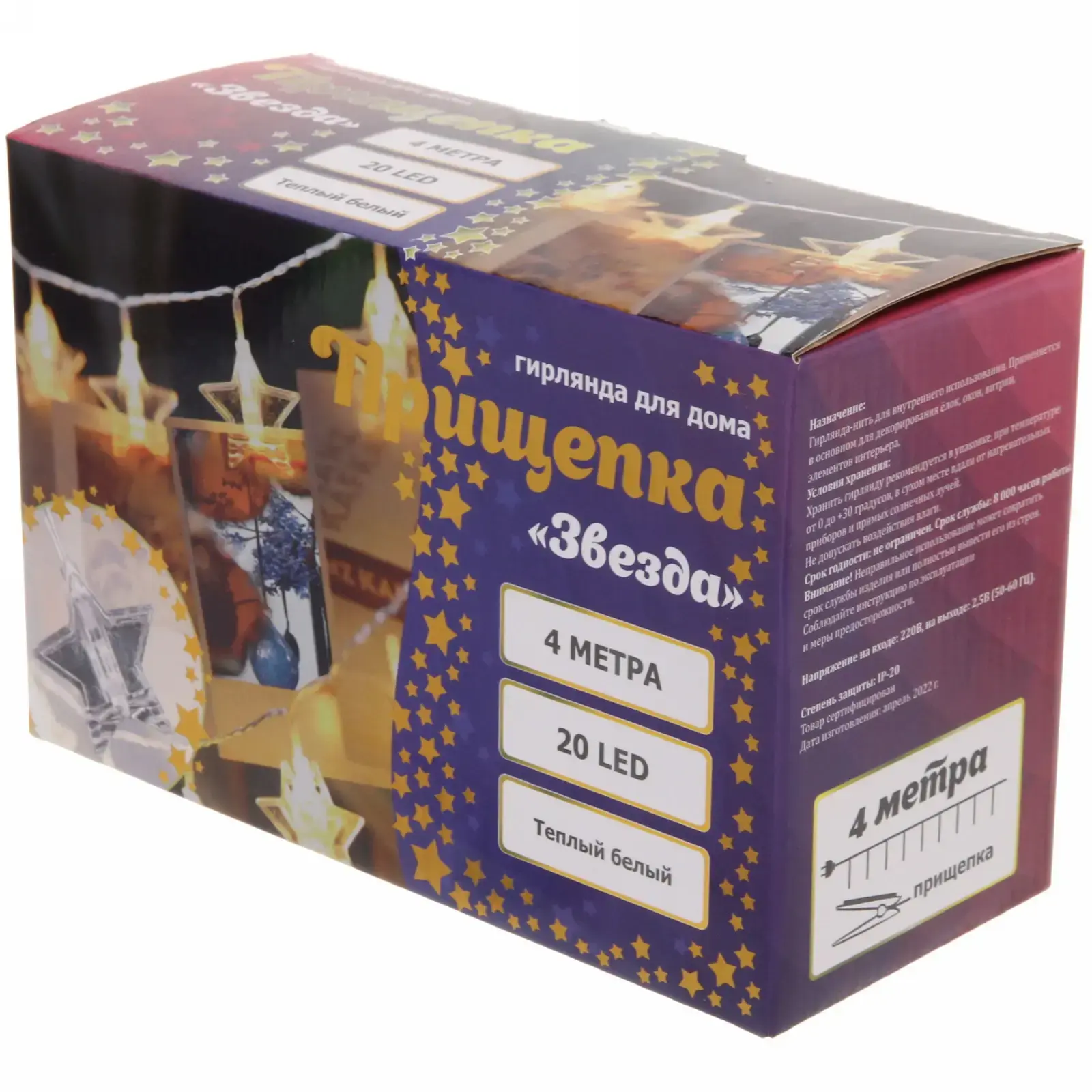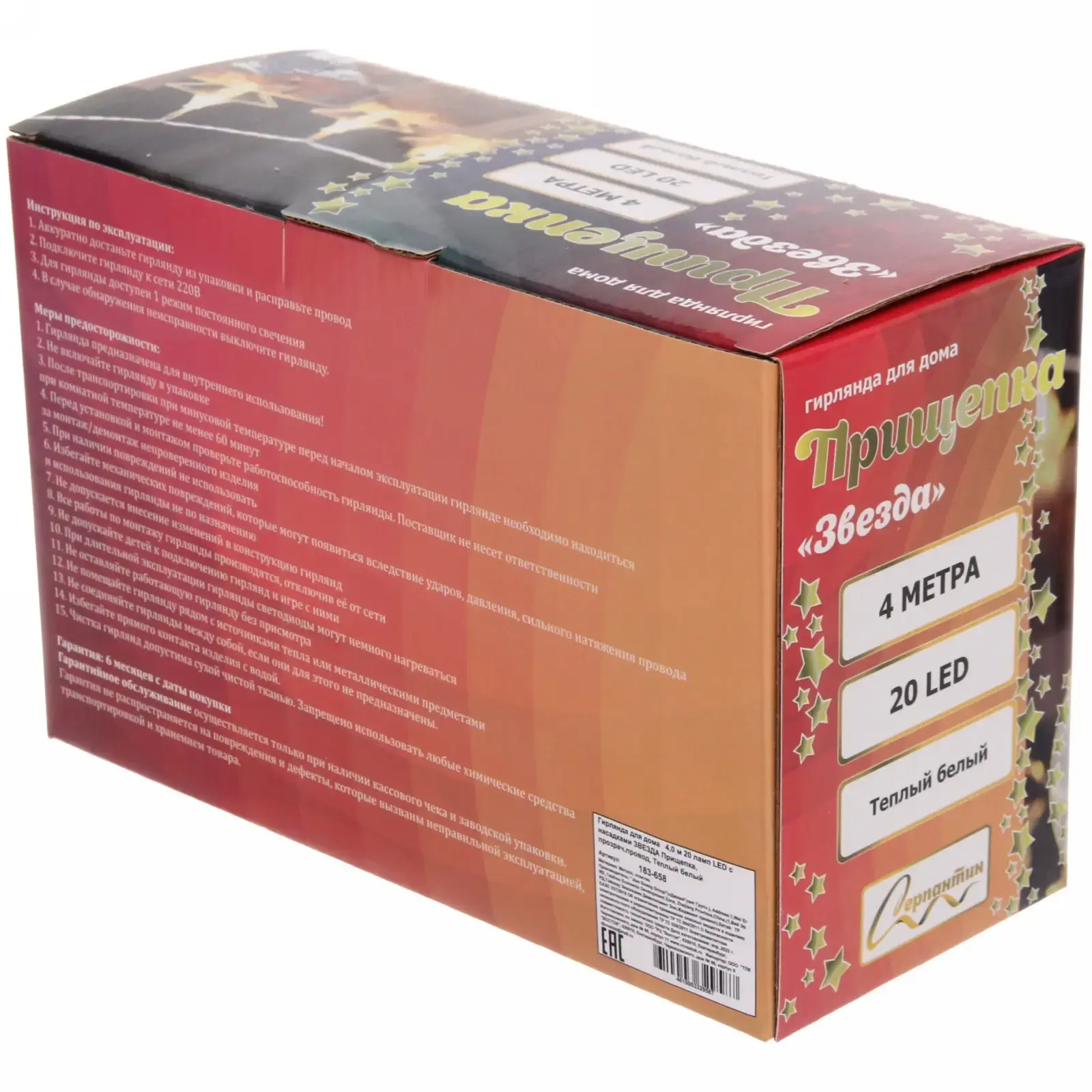 Гирлянда состоит из 20 светодиодов, которые равномерно распределены по длине в 4 метра. Каждый элемент гирлянды выполнен в форме звезды, что добавляет оригинальности и праздничного настроения. Материалы, использованные в производстве, включают металл и пластик, что обеспечивает надежность и долговечность. Гирлянда станет отличным дополнением к вашему новогоднему декору и поможет создать незабываемую атмосферу праздника.