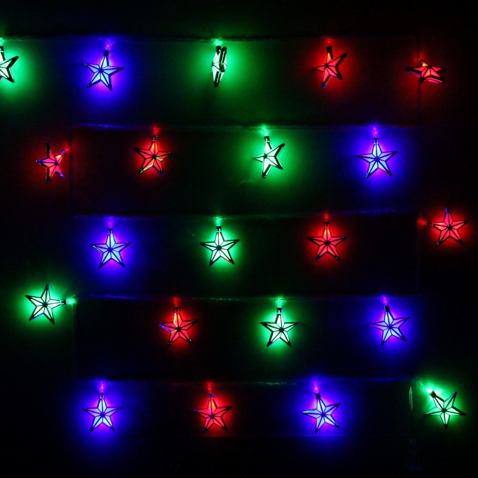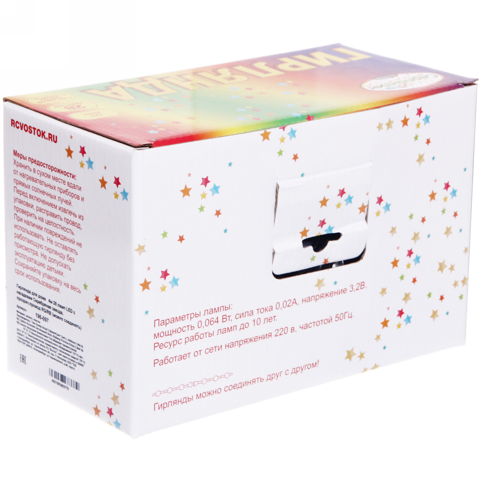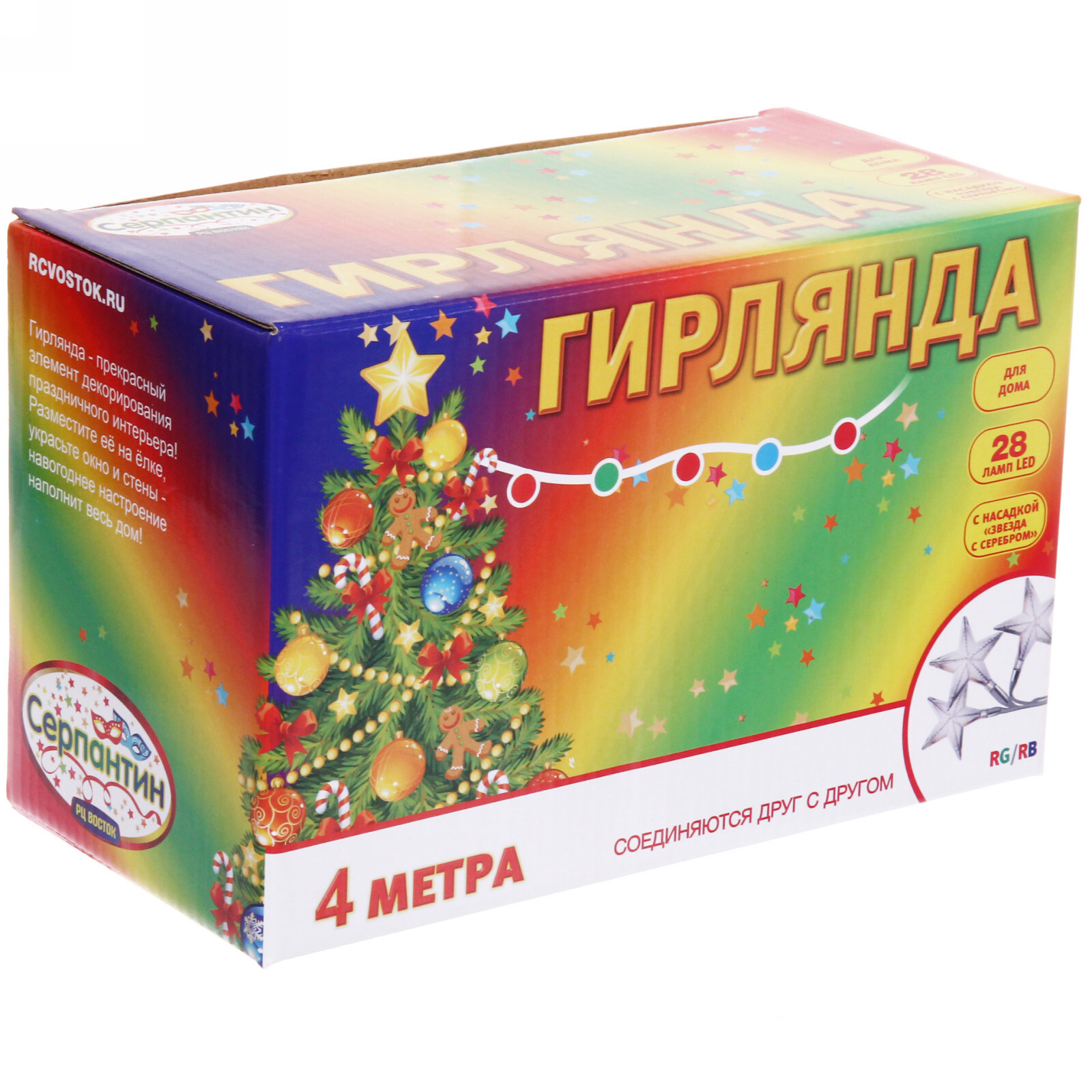 Гирлянда выполнена из качественных материалов: металл и пластик обеспечивают долговечность и надежность. Насадки в виде звезд выполнены из прозрачного пластика, что создает эффект мерцания и добавляет яркости. Длина гирлянды составляет 4 метра, а количество ламп — 28, что позволяет украсить даже большие пространства.