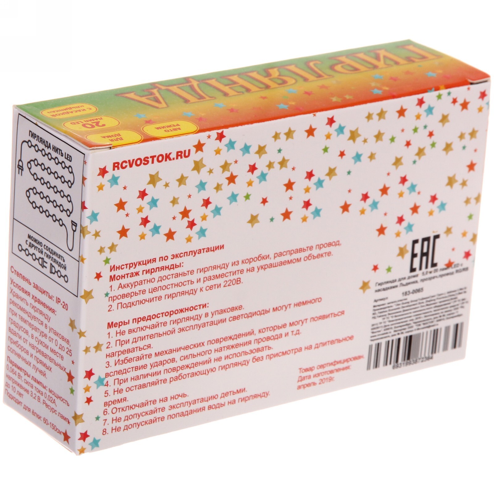Гирлянда имеет степень защиты IP-20, что делает ее безопасной для использования в помещениях. Длина гирлянды составляет 5 метров, а количество ламп — 20, что позволяет создать яркое и насыщенное освещение. Насадки в виде кристаллов льда добавляют изысканности и стиля, делая гирлянду настоящим украшением вашего интерьера.