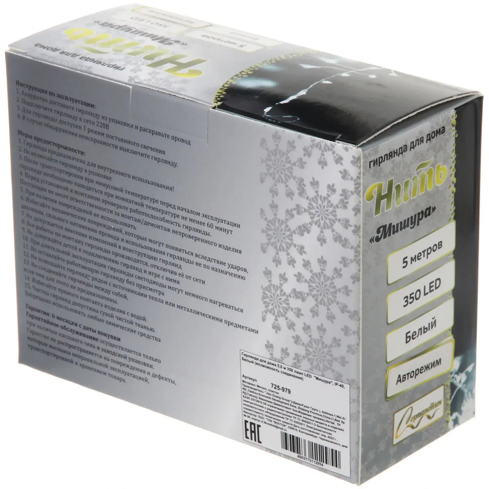 Гирлянда выполнена из качественных материалов: металл и пластик, что обеспечивает её долговечность. Белый цвет ламп создает мягкое и приятное освещение, а длина в 5 метров позволяет украсить даже большие пространства. Упаковка содержит инструкции по эксплуатации и меры предосторожности для безопасного использования.