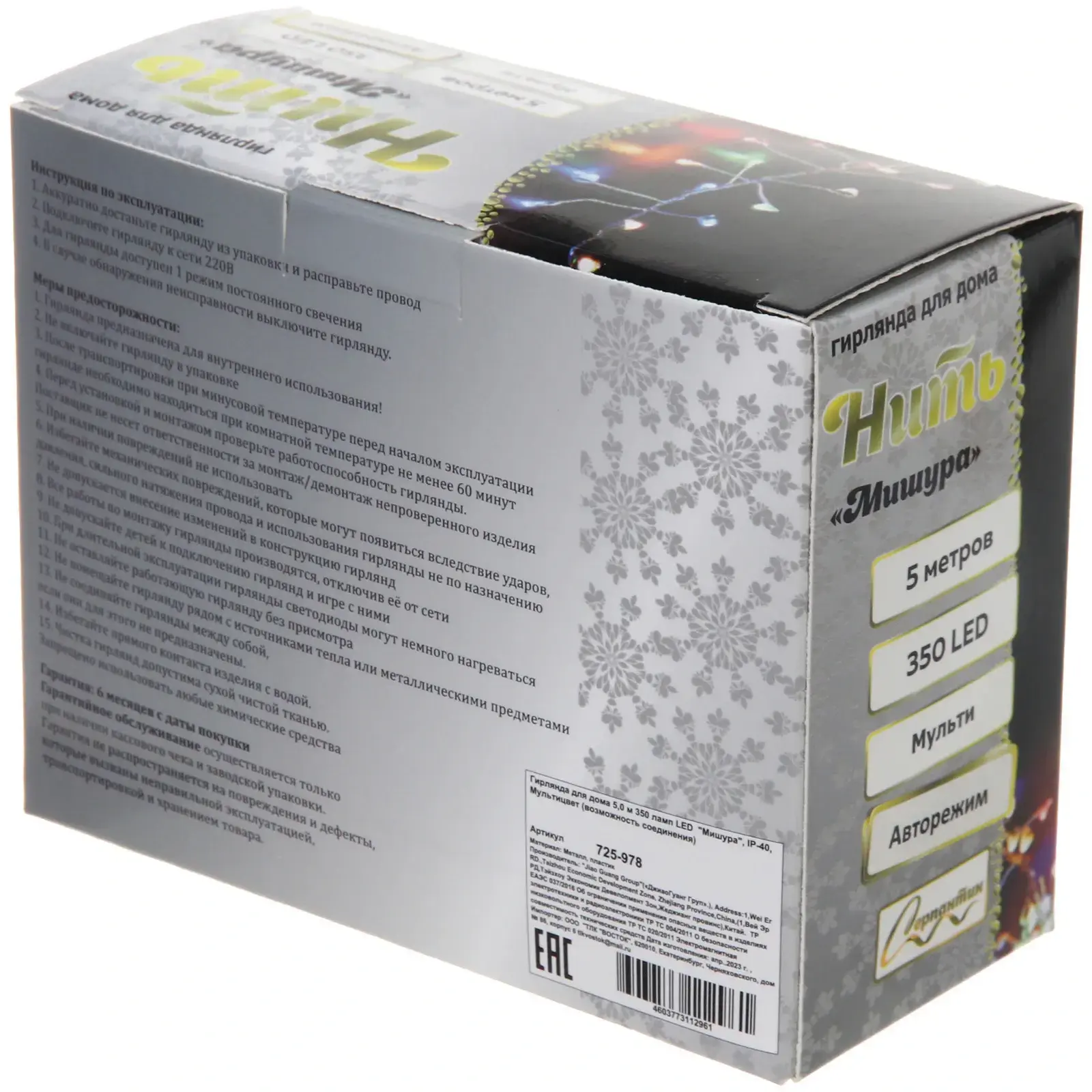 Гирлянда выполнена из качественных материалов: металл и пластик, что обеспечивает её прочность и долговечность. Длина гирлянды составляет 5,0 метров, а количество светодиодов — 350, что позволяет создать яркое и насыщенное освещение. Гирлянда работает в режиме «мульти», что позволяет менять режимы работы и создавать различные световые эффекты. Не упустите возможность сделать ваш праздник незабываемым с гирляндой LED «Мишура»!