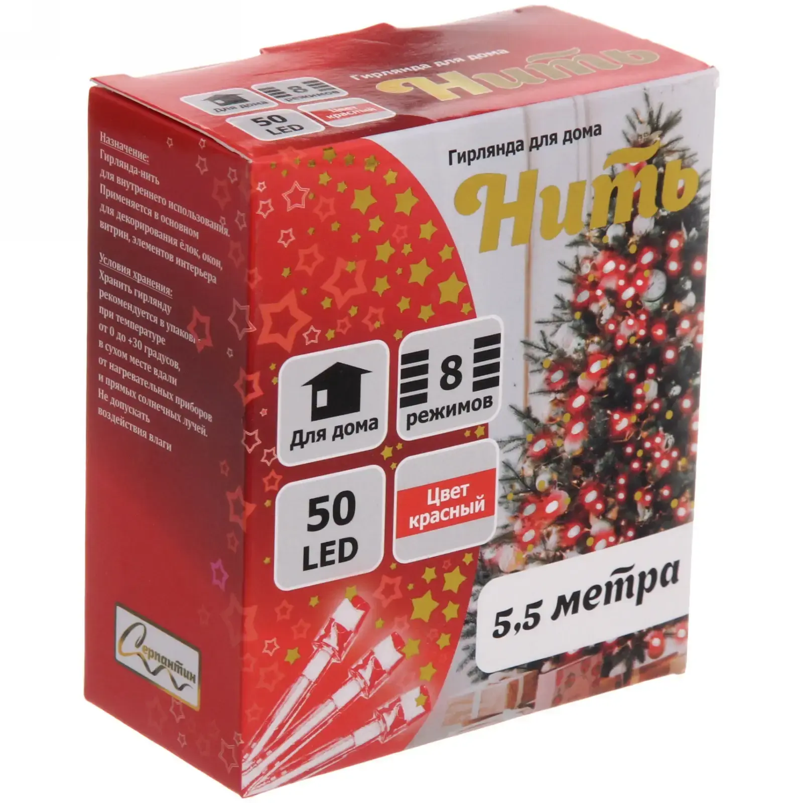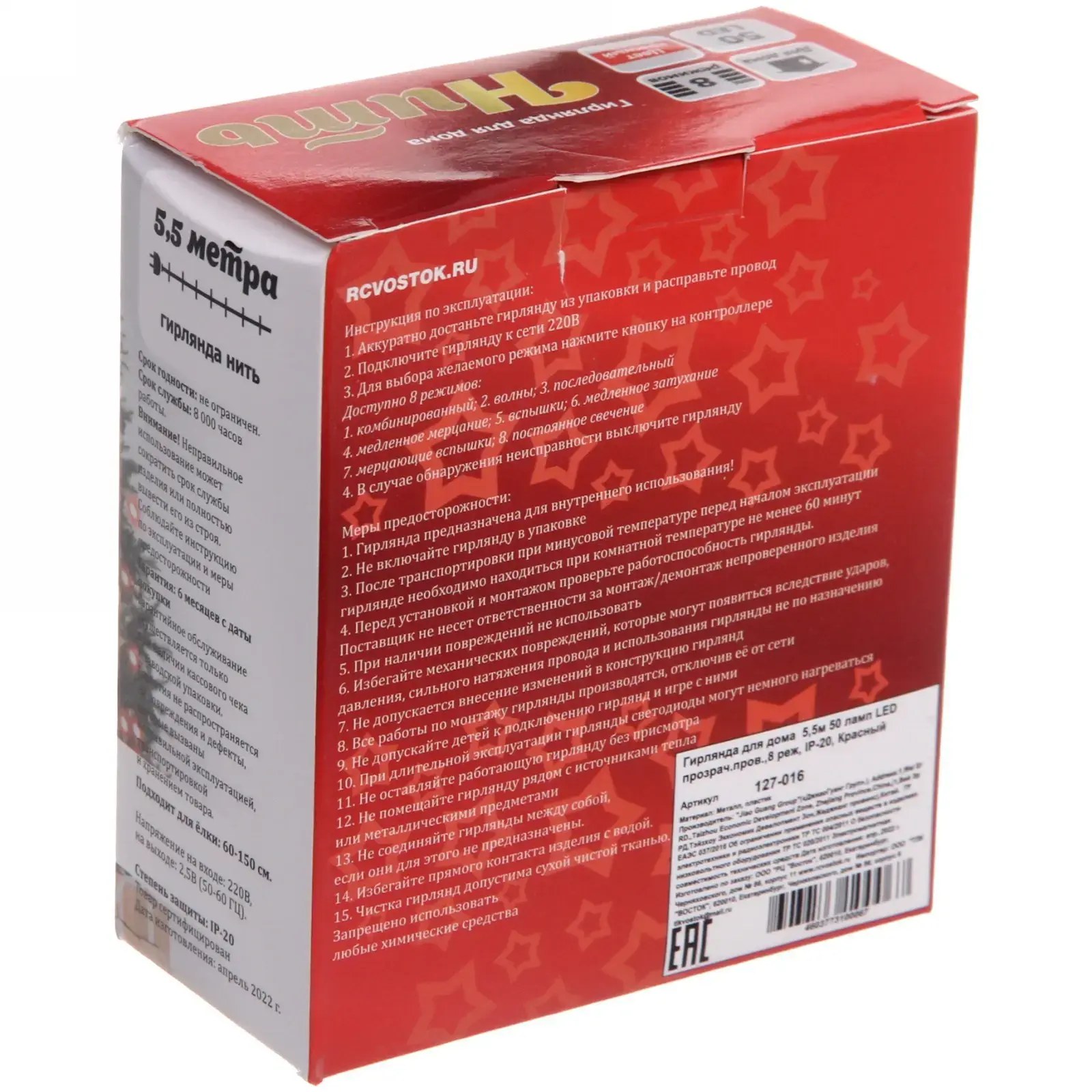 Гирлянда для дома 5,5м 50 ламп LED прозрач.пров.,8 реж, IP-20, Красный