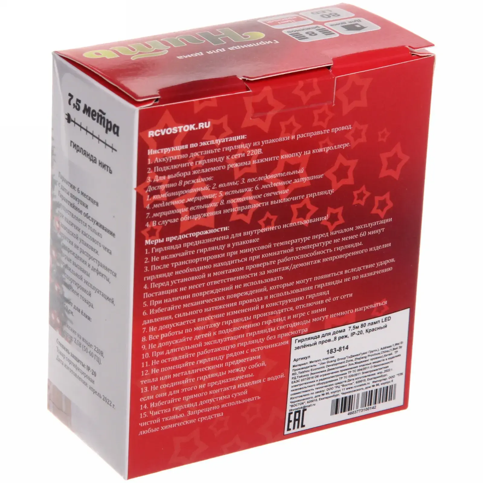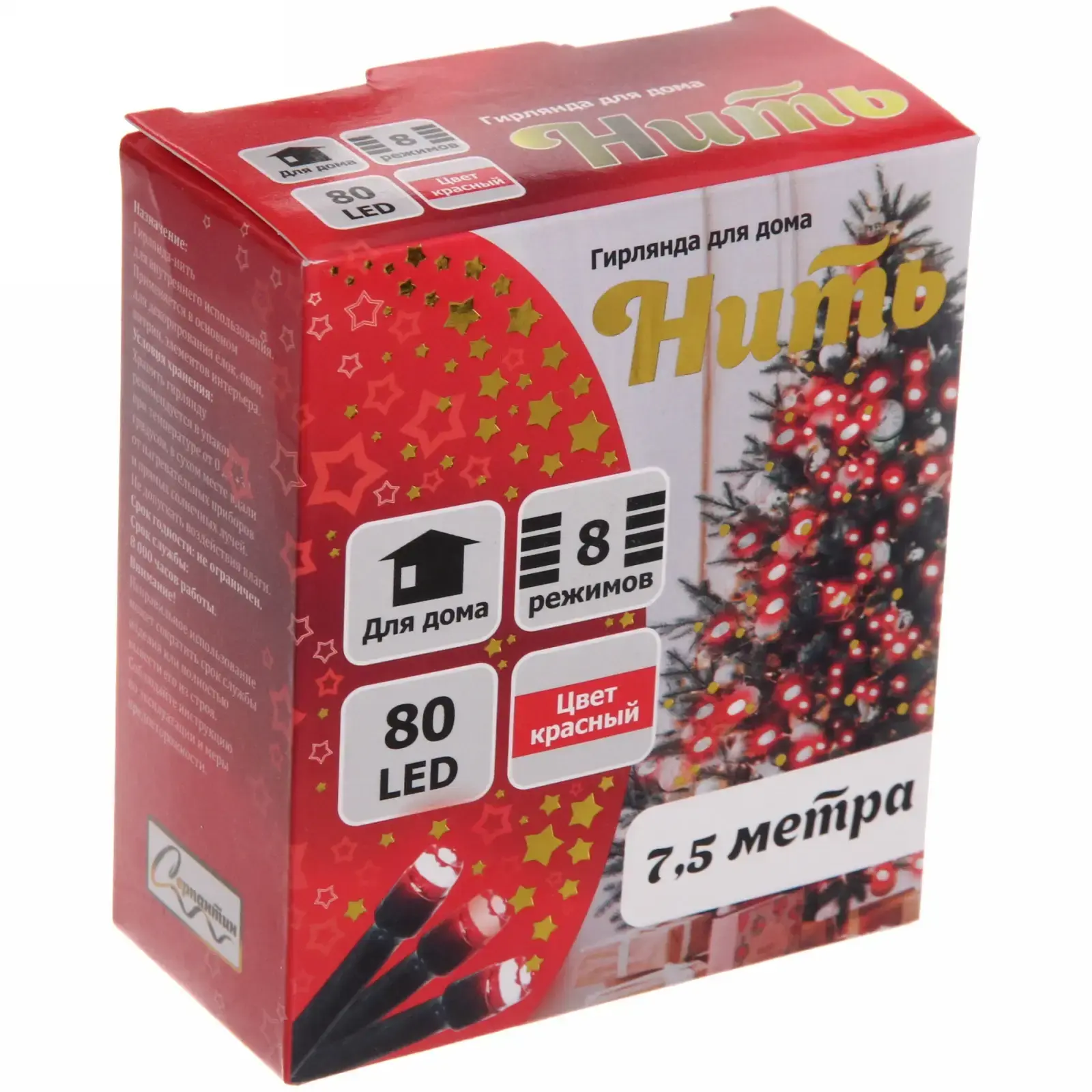 Гирлянда для дома 7,5м 80 ламп LED зелёный пров.,8 реж, IP-20, Красный