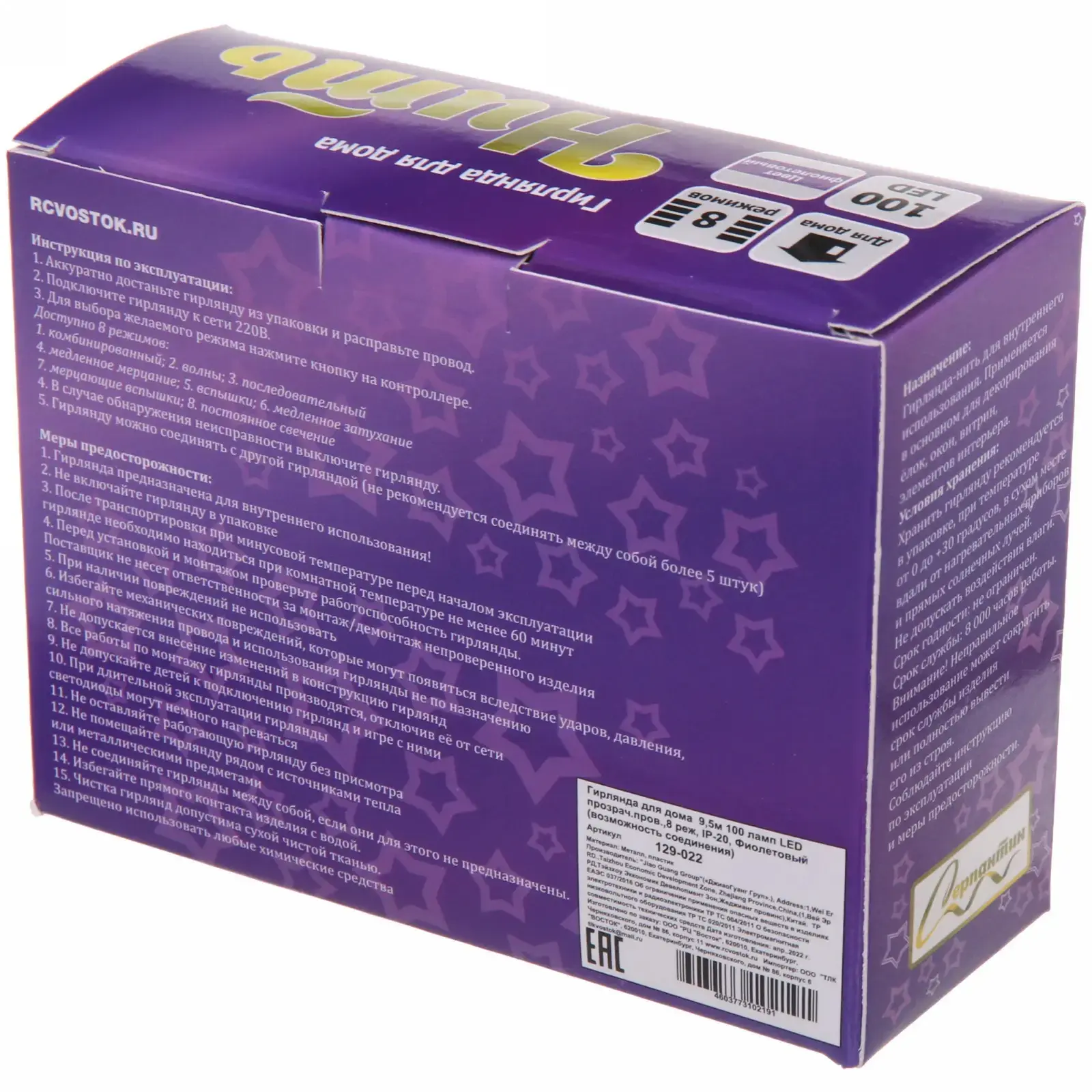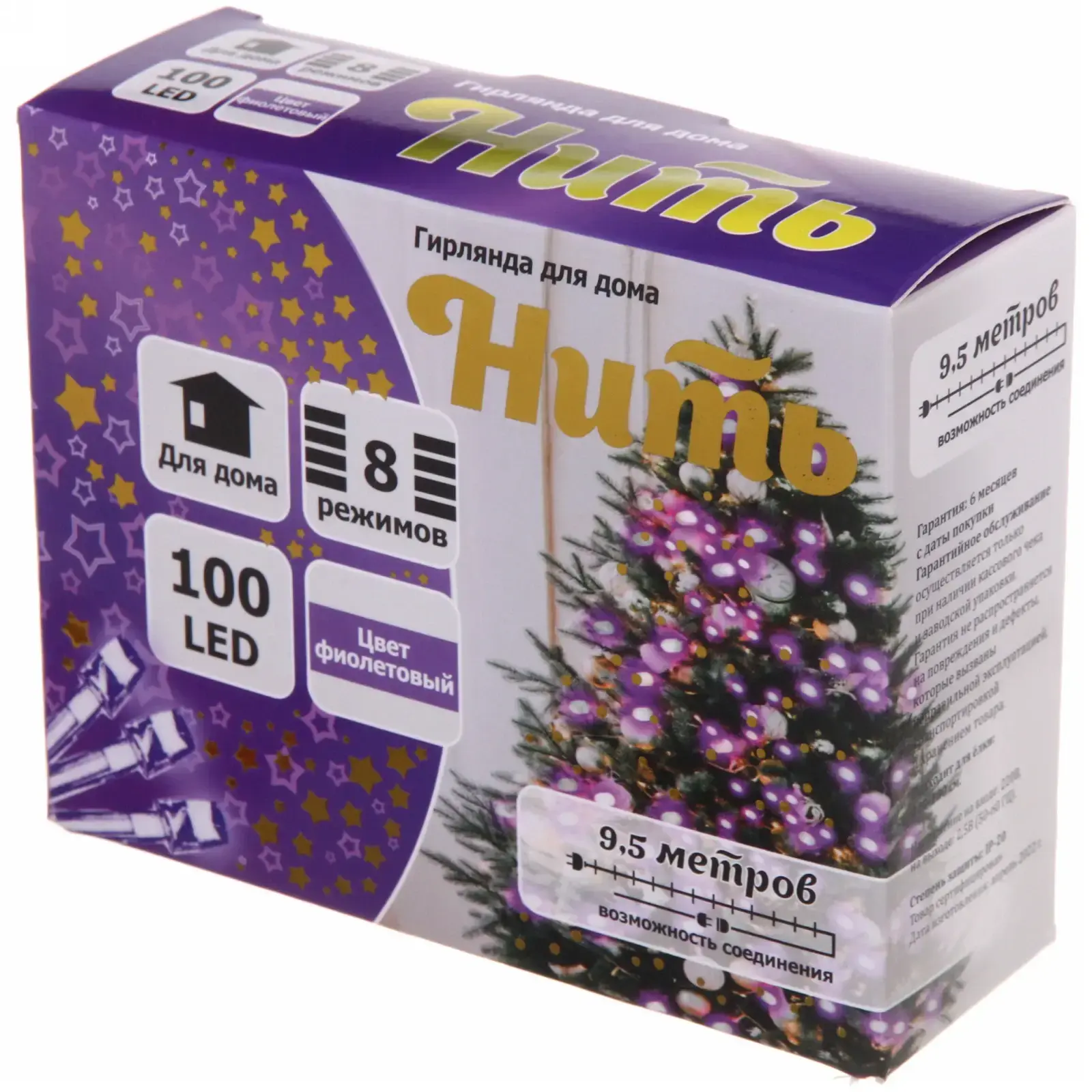 Длина гирлянды — 9,5 метров, количество ламп — 100 (LED), цвет свечения — фиолетовый. Прозрачный ПВХ-провод, материалы: металл и пластик. Лёгкая установка и простое переключение режимов делает гирлянду универсальным решением для праздничного декора вашего дома.