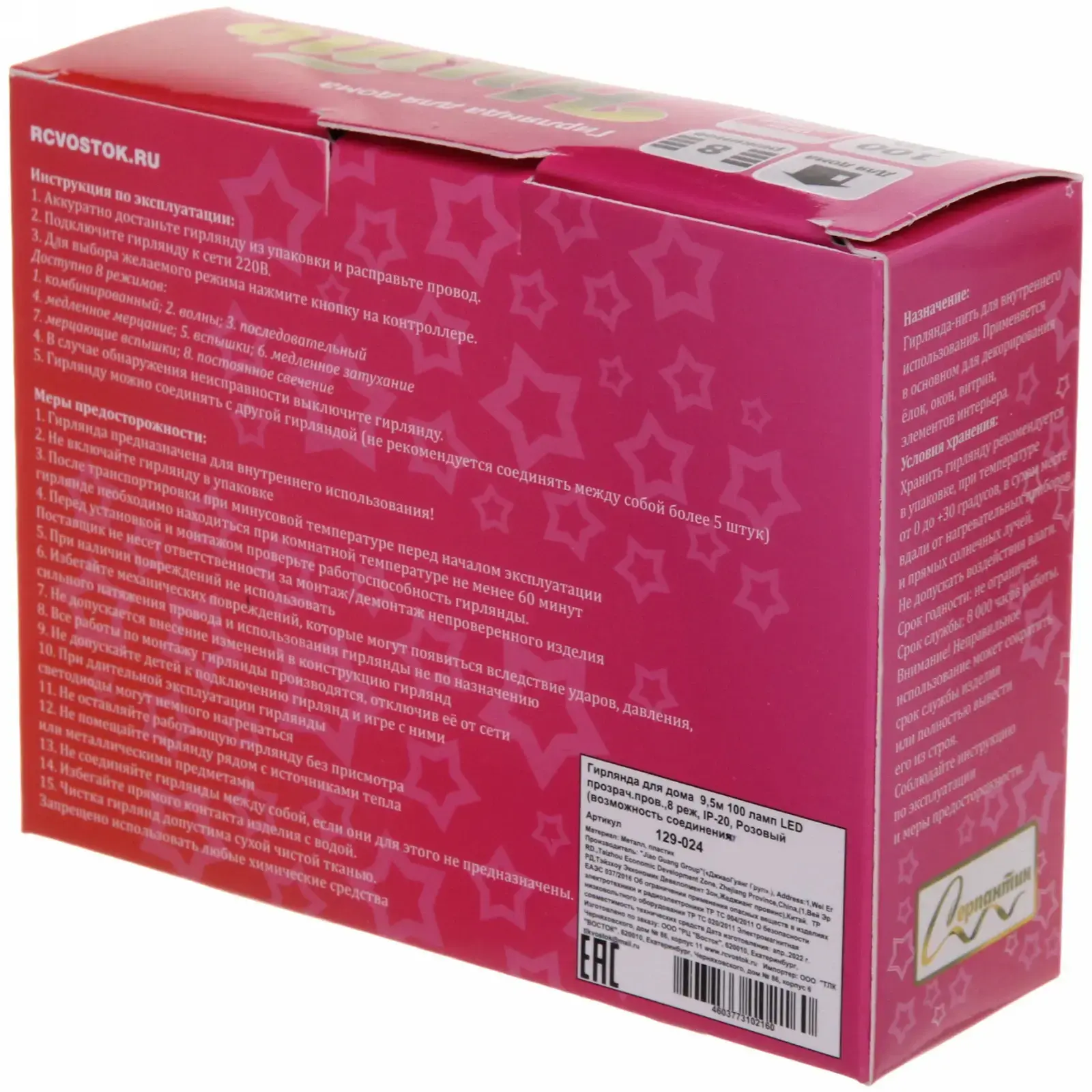 Гирлянда предназначена для использования в помещениях и имеет 8 различных режимов работы, включая мигание, плавное затухание и постоянное свечение. Это позволяет вам легко менять атмосферу в зависимости от настроения или события. Простая установка и возможность подключения к электросети делают её удобной в использовании.