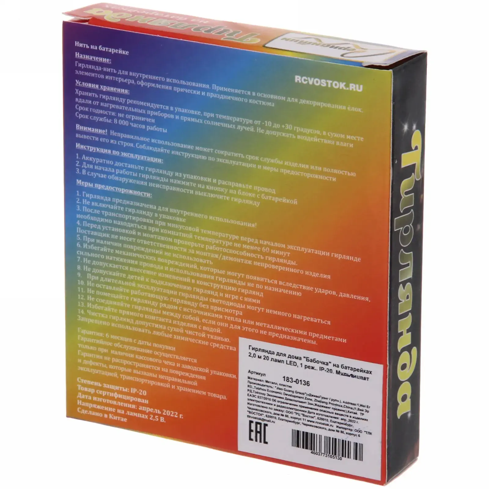 Создайте атмосферу уюта и праздника с гирляндой для дома 'Бабочка'. Эта гирлянда длиной 2 метра с 20 светодиодами в мультицвете станет идеальным решением для декорирования вашего пространства. Она работает на батарейках, что делает её мобильной и удобной для использования в любом месте — от комнаты до вечеринки на улице.