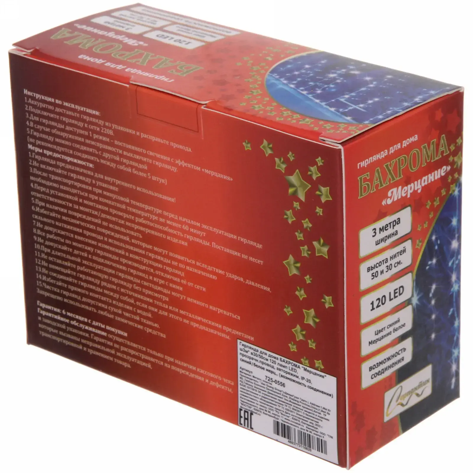 Гирлянда длиной 3 метра оснащена 120 яркими светодиодами, расположенными на нитях высотой 30 и 50 см. Степень защиты IP20 позволяет использовать изделие исключительно в помещении. Питается от стандартной электросети.