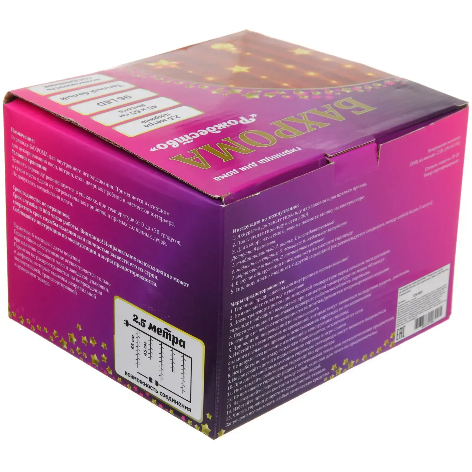 Гирлянда выполнена из прочного металла и пластика, что делает ее устойчивой к внешним воздействиям. Размеры: ширина 2,5 метра, высота 0,45/0,65 метра. Цвет свечения — теплый белый, что создает уютную атмосферу. IP-20 защищает гирлянду от влаги, что делает ее безопасной для использования в помещениях.