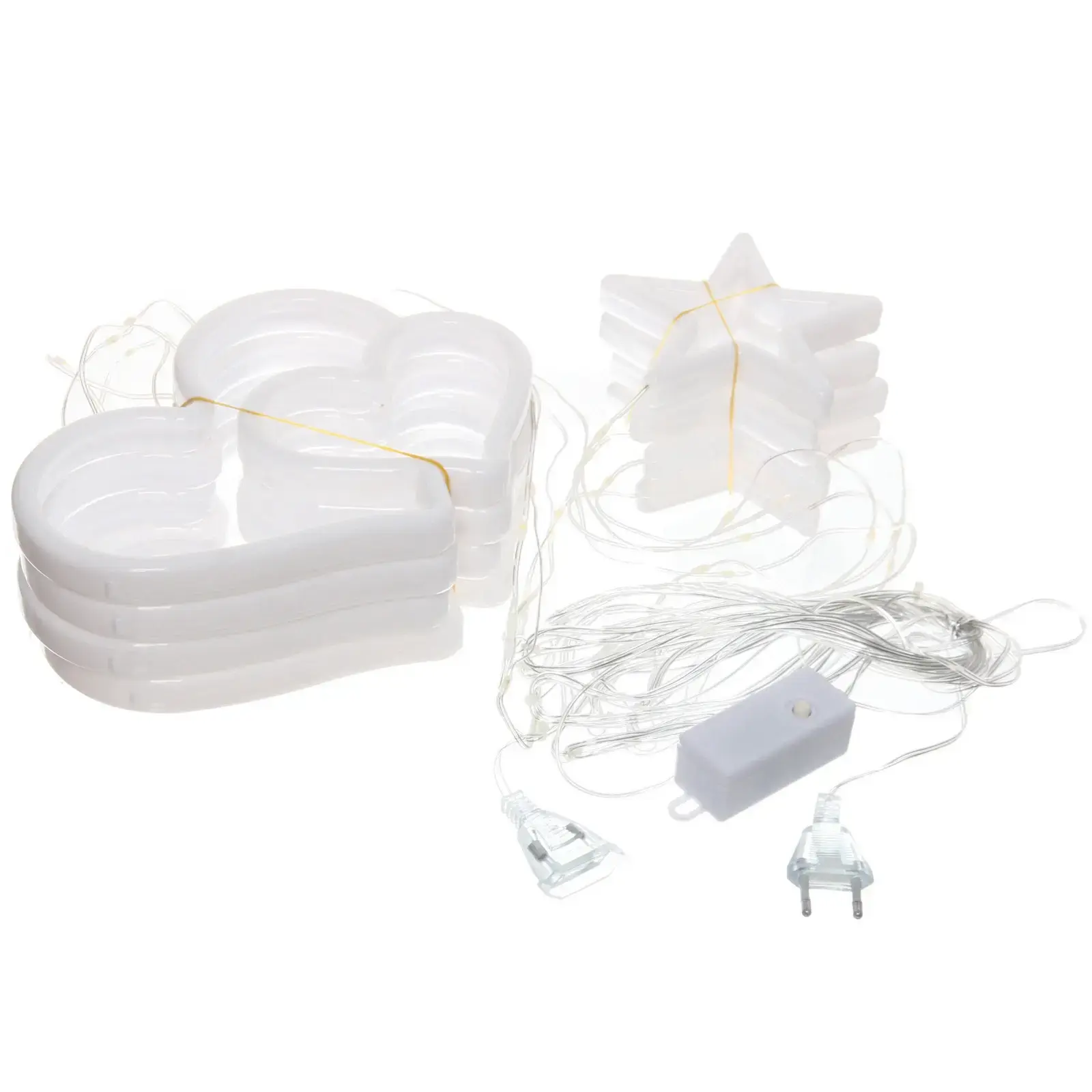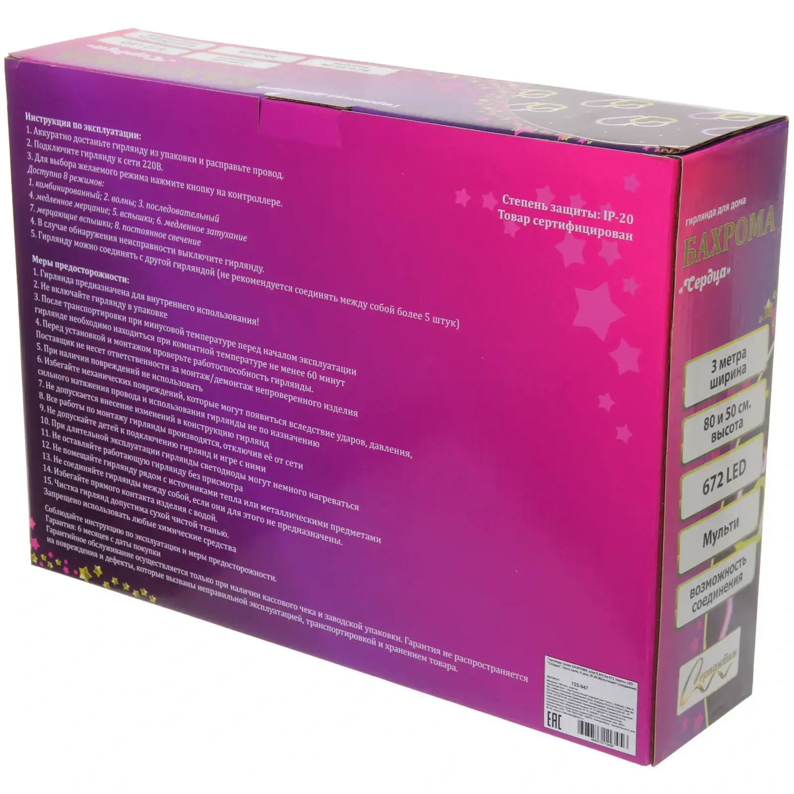 Гирлянда выполнена из качественных материалов: металл и пластик, что обеспечивает её долговечность. Размеры гирлянды: ширина 3 метра, высота 80 см и 50 см. Упаковка содержит всю необходимую информацию о подключении и эксплуатации, что делает её идеальным выбором для тех, кто ценит комфорт и стиль.