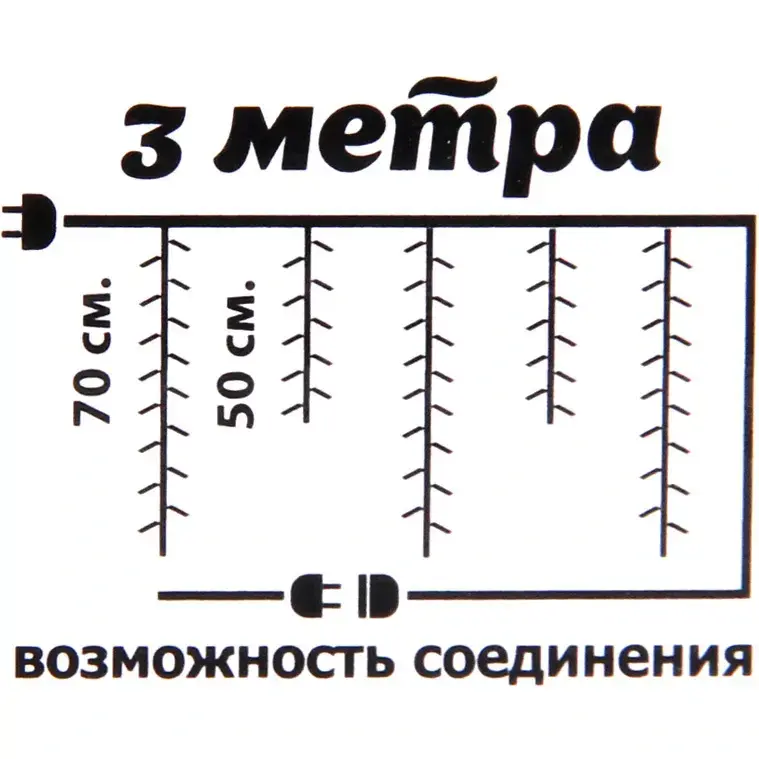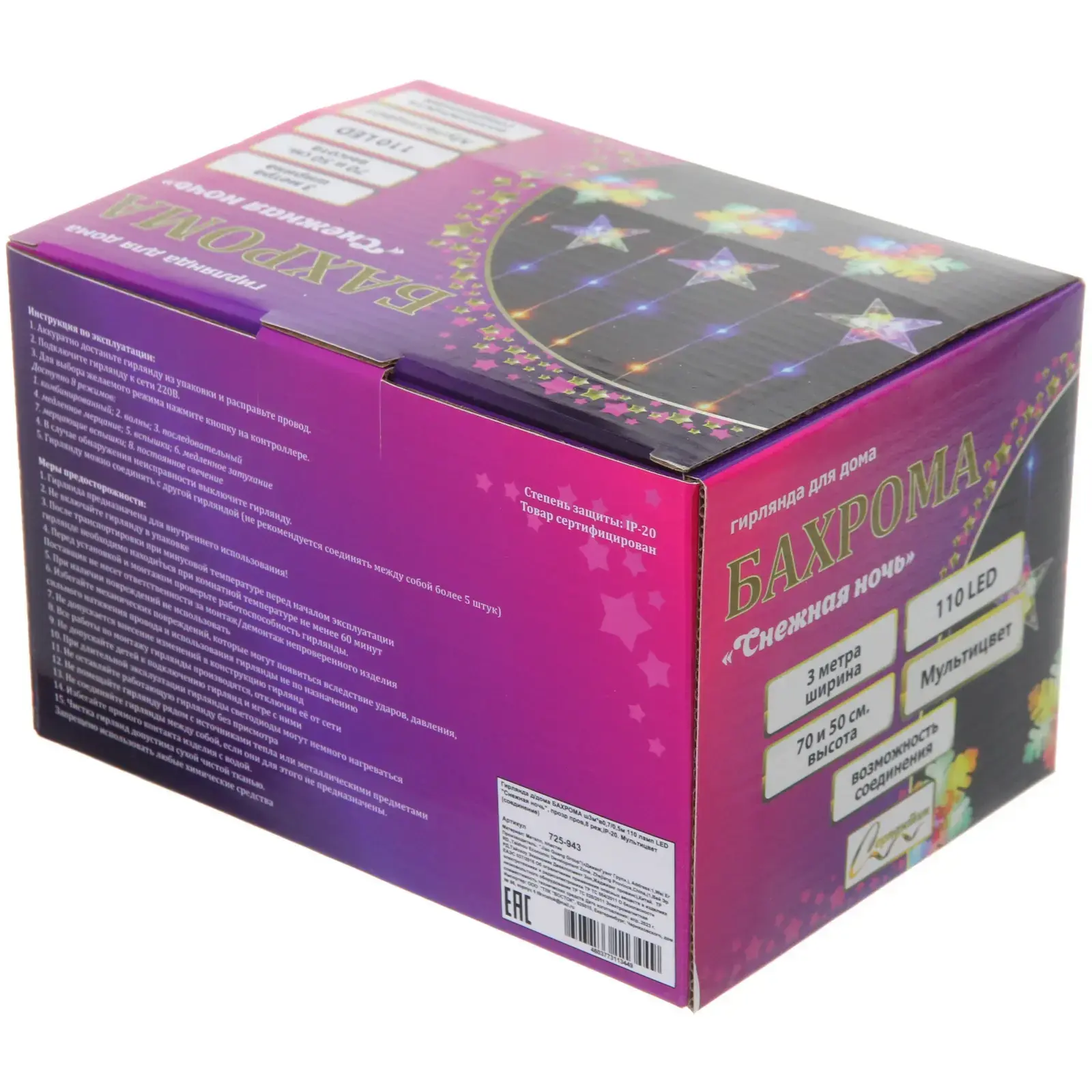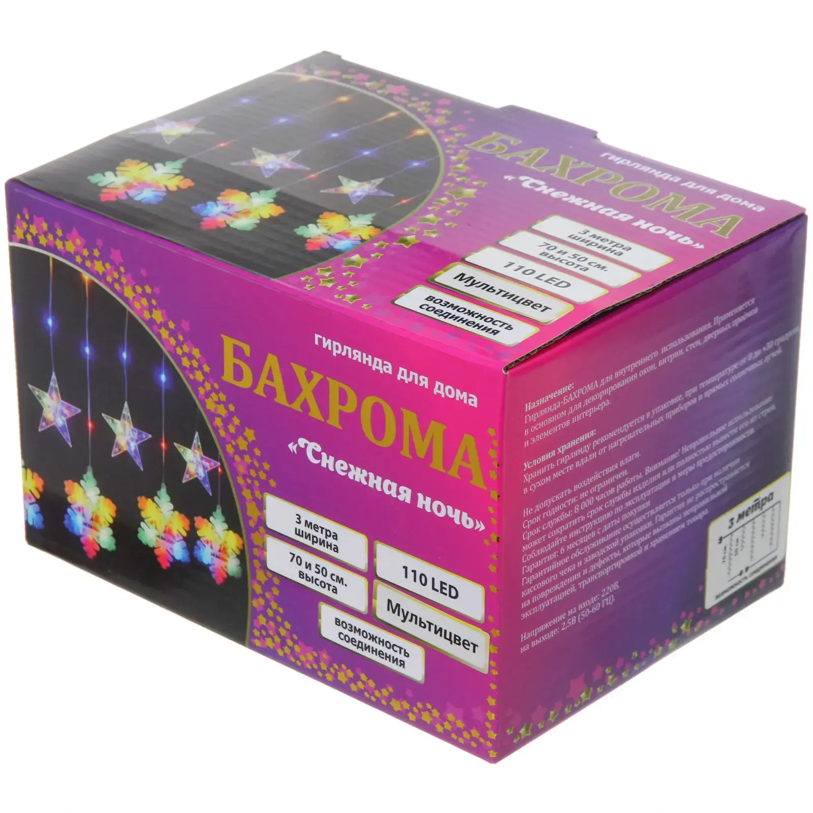 Гирлянда выполнена из качественных материалов: металл и пластик, что обеспечивает долговечность и надежность. Размеры гирлянды составляют 3 метра в длину, ширина — 70 см, высота — 50 см. Упаковка содержит всю необходимую информацию о характеристиках и способах использования. Не упустите возможность сделать ваш дом более уютным и красивым с гирляндой 'Снежная ночь'!
