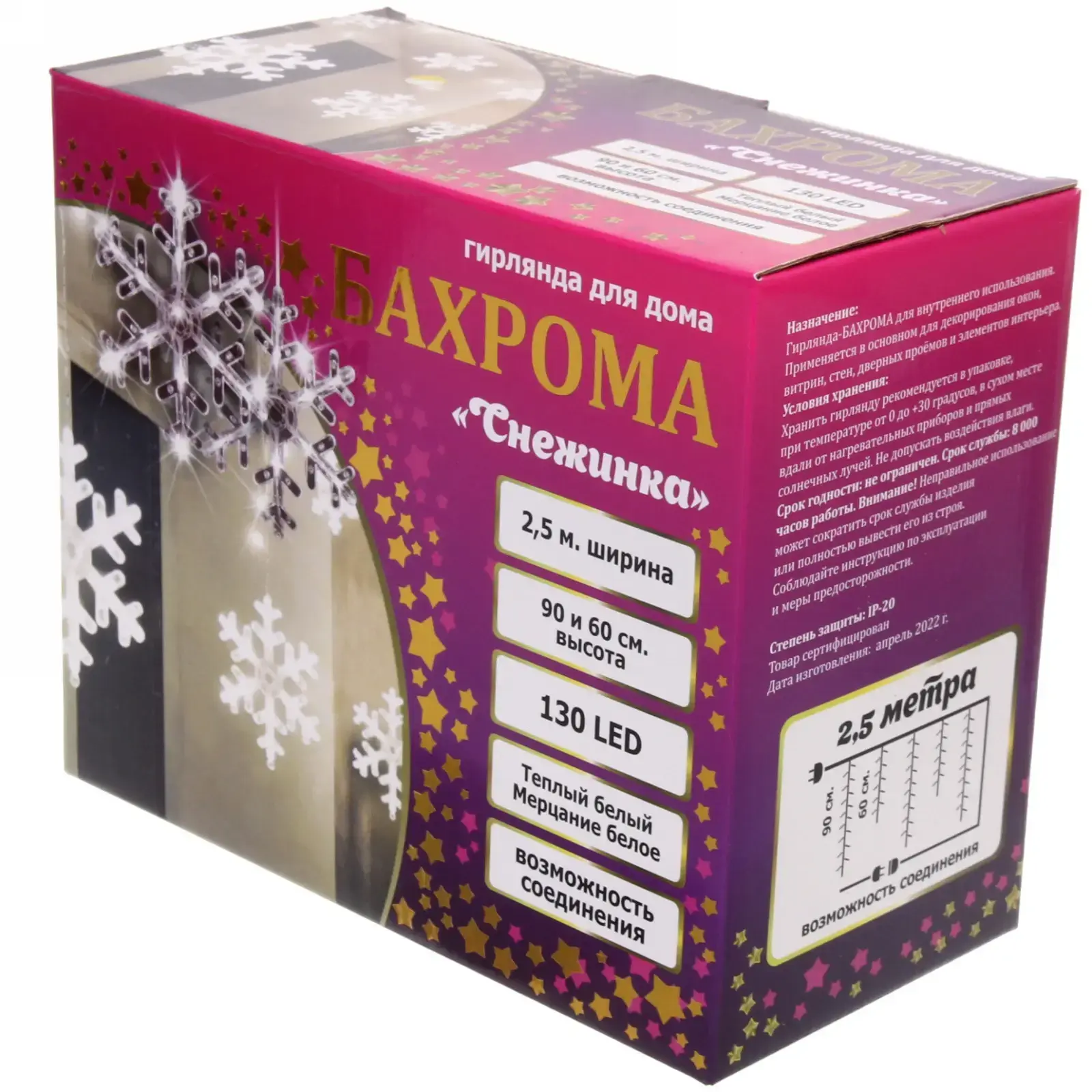 Гирлянда имеет длину 2,5 метра при ширине подвеса 0,6-0,9 метра. Элементы выполнены из прочного пластика с металлическими проводами, что гарантирует долговечность использования. Мерцающий теплый белый свет особенно эффектно смотрится в вечернее время.