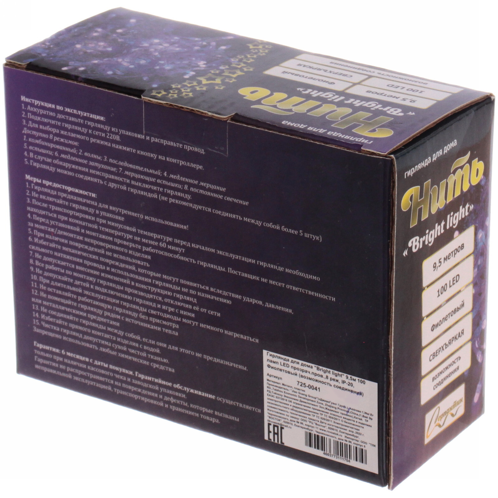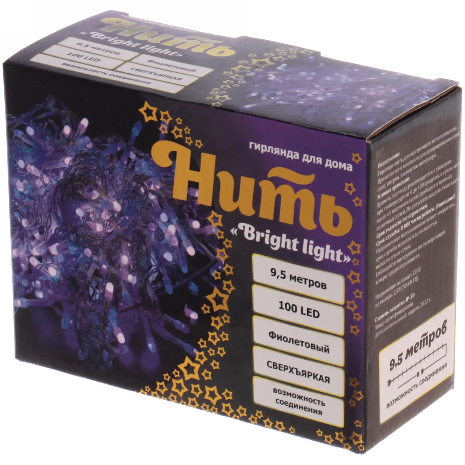 Гирлянда легко подключается к электросети и управляется с помощью встроенного блока с режимами. Материал: металл и пластик, длина провода — 9,5 м, цвет ламп — фиолетовый, прозрачный провод делает освещение более эффектным. Создайте неповторимую атмосферу у себя дома и радуйте близких яркими световыми эффектами!