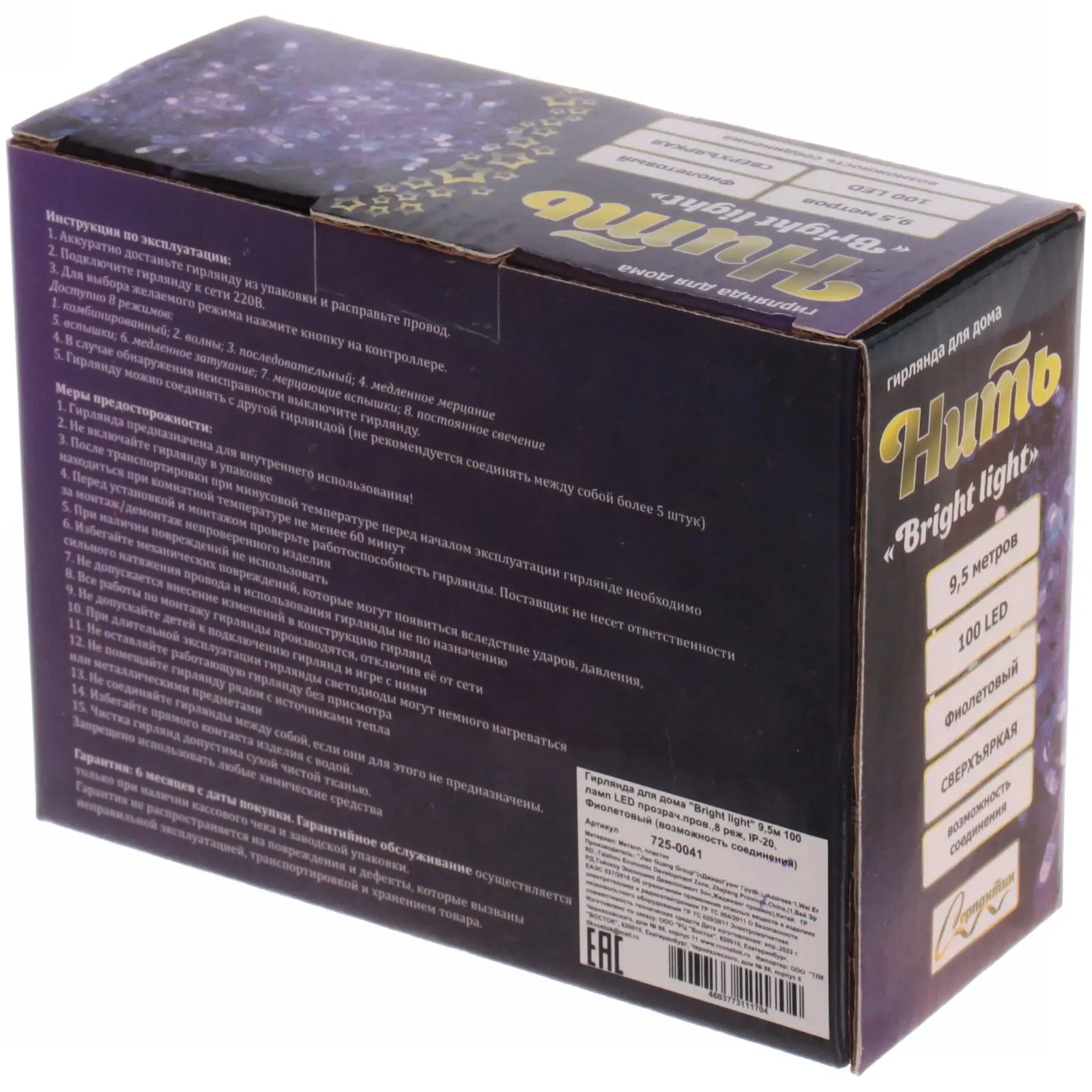 Эта гирлянда длиной 9,5 метра с 100 яркими LED-лампами фиолетового цвета преобразит любое пространство, сделая его уютным и праздничным. Благодаря прозрачному проводу и 8 режимам работы, вы легко сможете выбрать подходящий режим освещения для любого настроения или события.