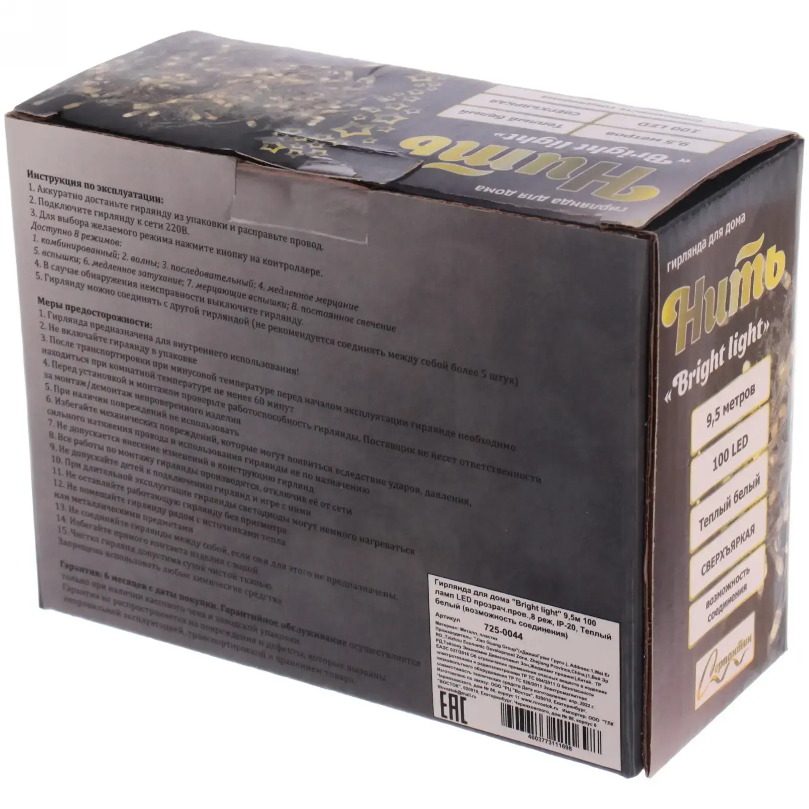 Создайте атмосферу уюта и праздника с гирляндой «Bright Light». Эта стильная гирлянда длиной 9,5 метров с 100 яркими LED-лампами излучает теплый белый свет, который идеально подходит для украшения вашего дома в любое время года. Благодаря возможности соединения нескольких гирлянд, вы можете легко расширить освещение и создать уникальные световые композиции.