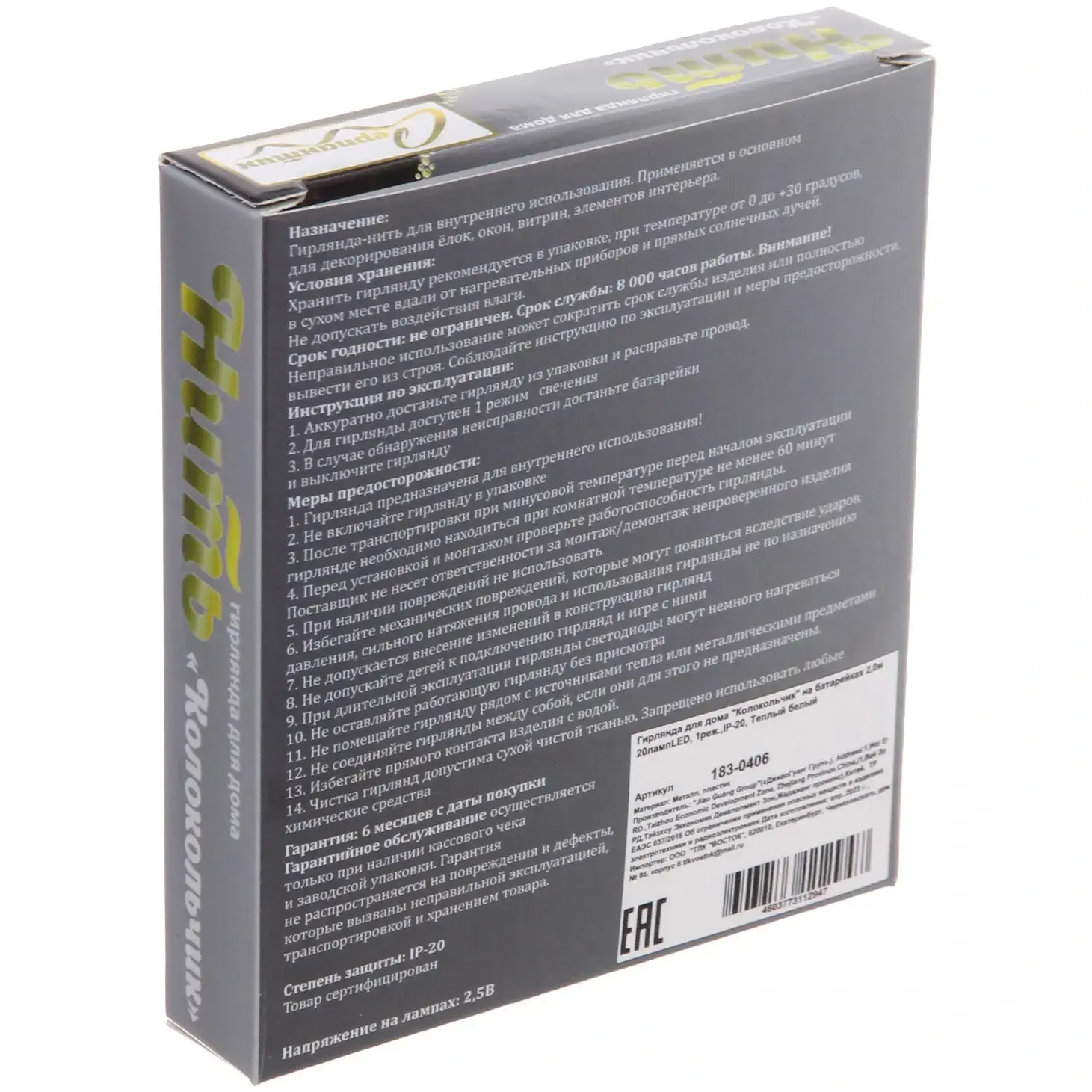 Гирлянда выполнена из качественных материалов — металла и пластика, что обеспечивает её долговечность и надежность. Она имеет степень защиты IP-20, что делает её безопасной для использования в помещениях. Один режим работы позволяет легко управлять освещением, а теплый белый свет создает атмосферу уюта и спокойствия.