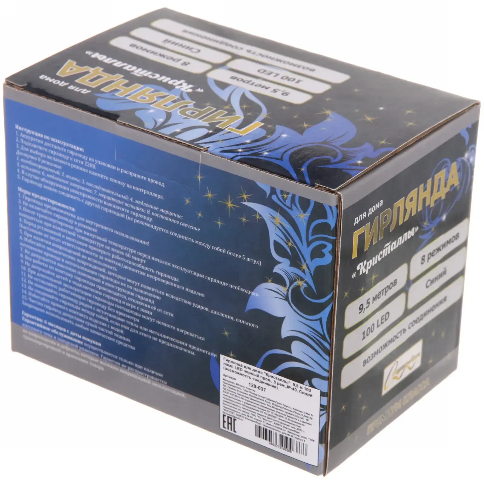 Гирлянда выполнена из качественных материалов: металл и пластик, что обеспечивает её долговечность и надежность. Длина гирлянды составляет 9,5 метров, а количество ламп — 100. Цвет светодиодов — синий, что придаёт особую атмосферу волшебства. Гирлянда подходит для использования как внутри помещений, так и на улице, что делает её универсальным решением для любого праздника.