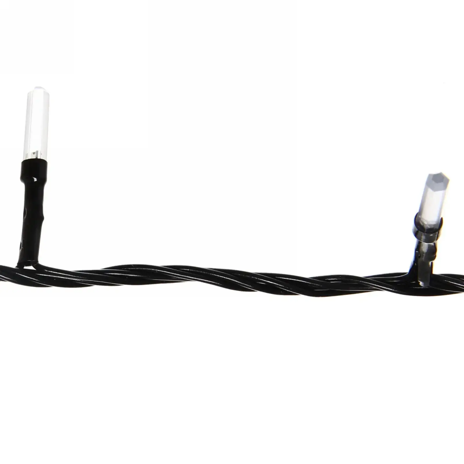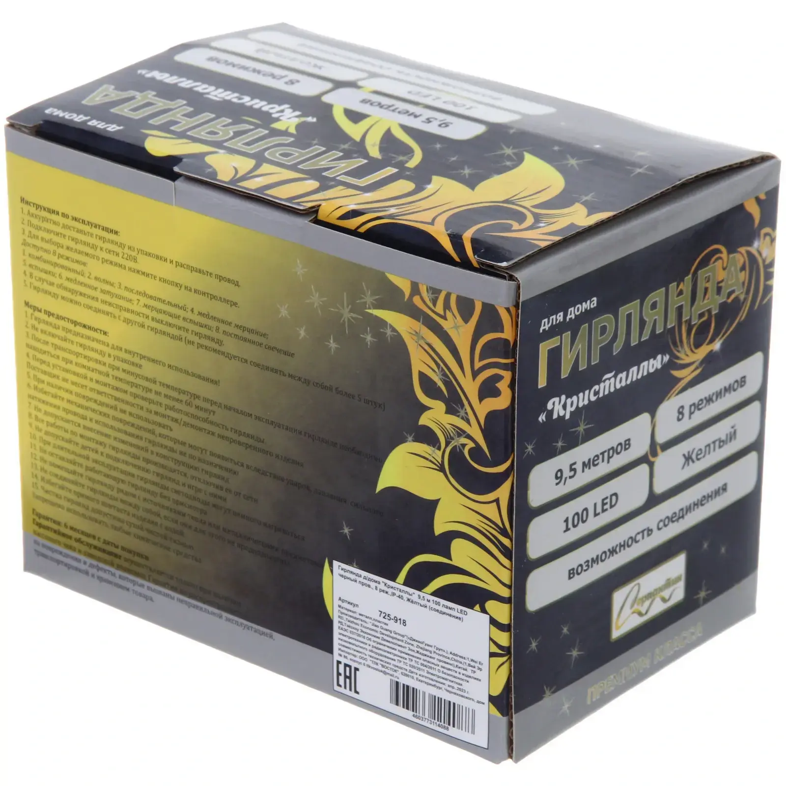 Гирлянда выполнена из качественных материалов: черный провод и пластиковые элементы обеспечивают долговечность и надежность. Длина гирлянды составляет 9,5 метров, а количество светодиодов — 100. Цвет свечения — желтый, что создает теплую и уютную атмосферу. Не упустите возможность сделать ваш дом более красивым и привлекательным с гирляндой LED «Кристаллы»!