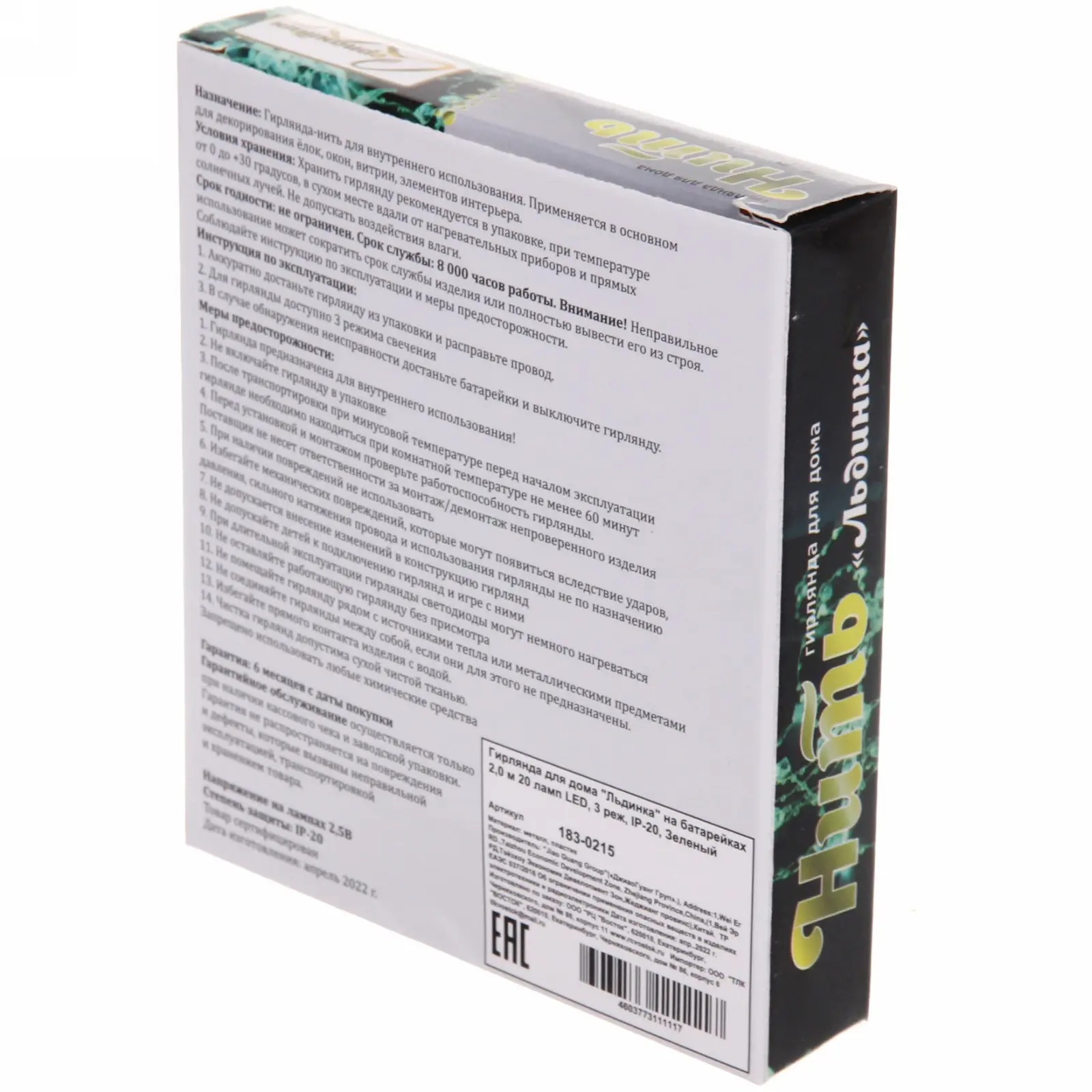Гирлянда для дома «Льдинка» на батарейках 2,0 м 20 ламп LED, 3 реж, IP-20, Зеленый