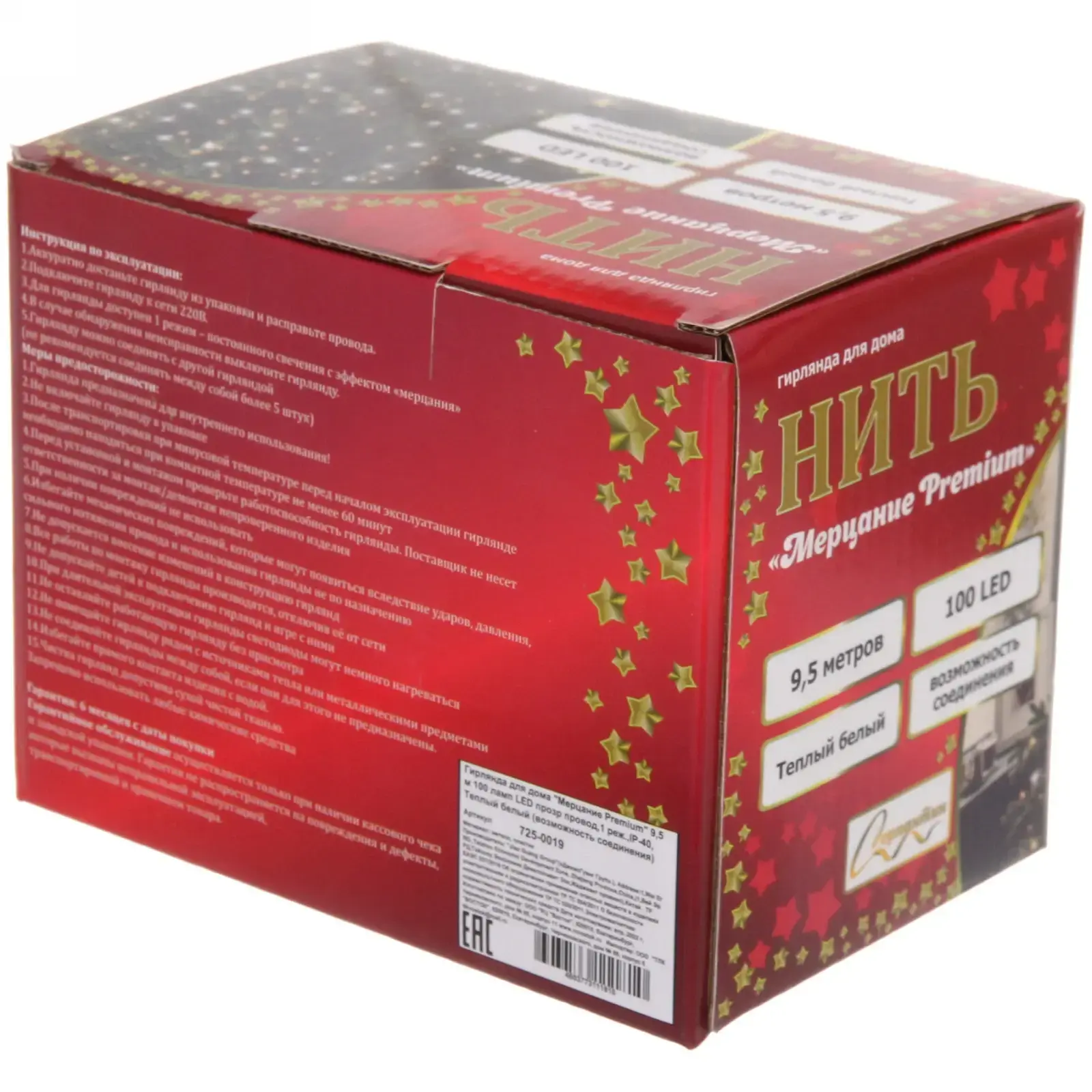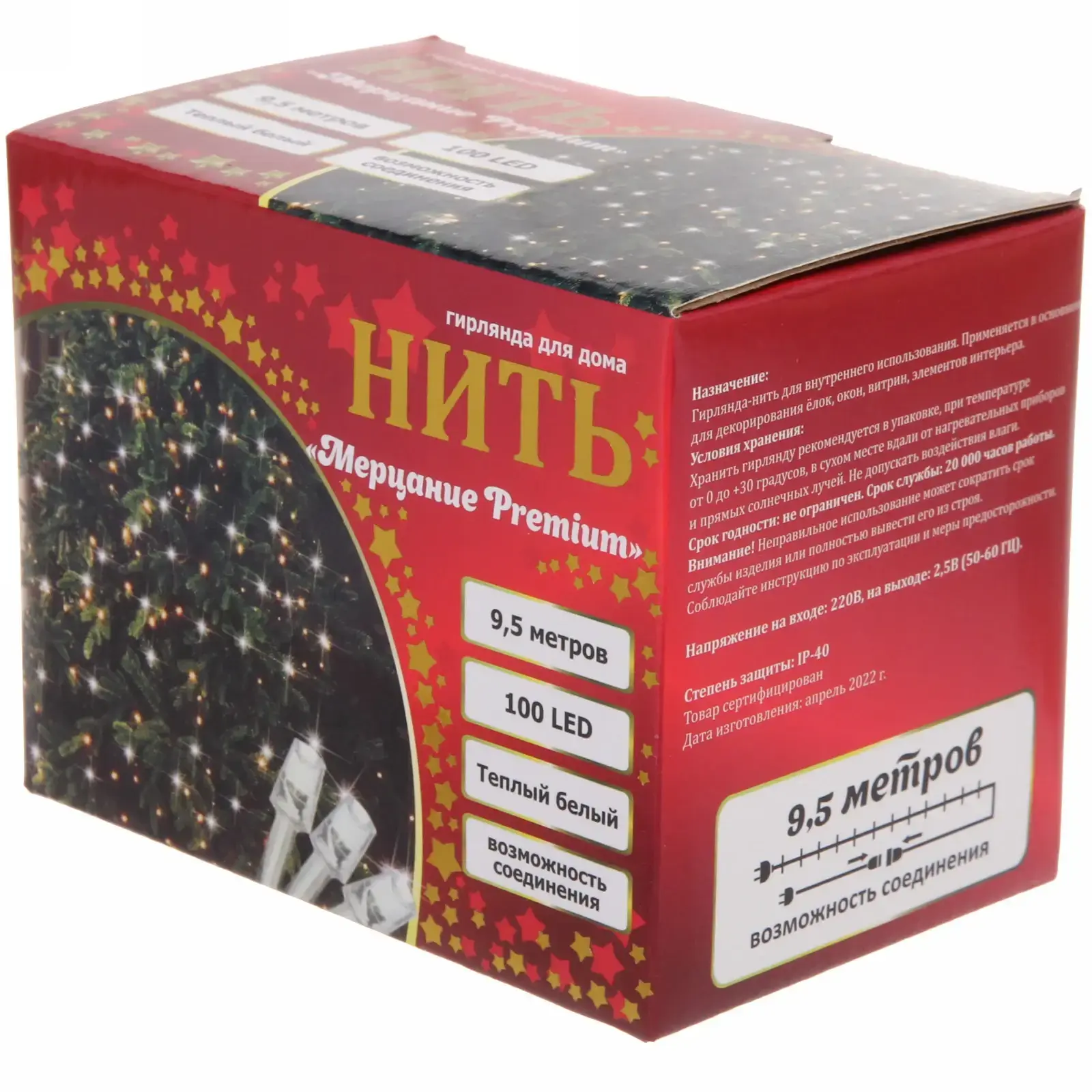 Длина 9,5 метров с равномерным распределением 100 LED-ламп обеспечивает эффектное освещение больших площадей. Теплый белый свет (2700К) создает комфортную атмосферу, а прозрачная проводка сохраняет эстетику декора в выключенном состоянии.