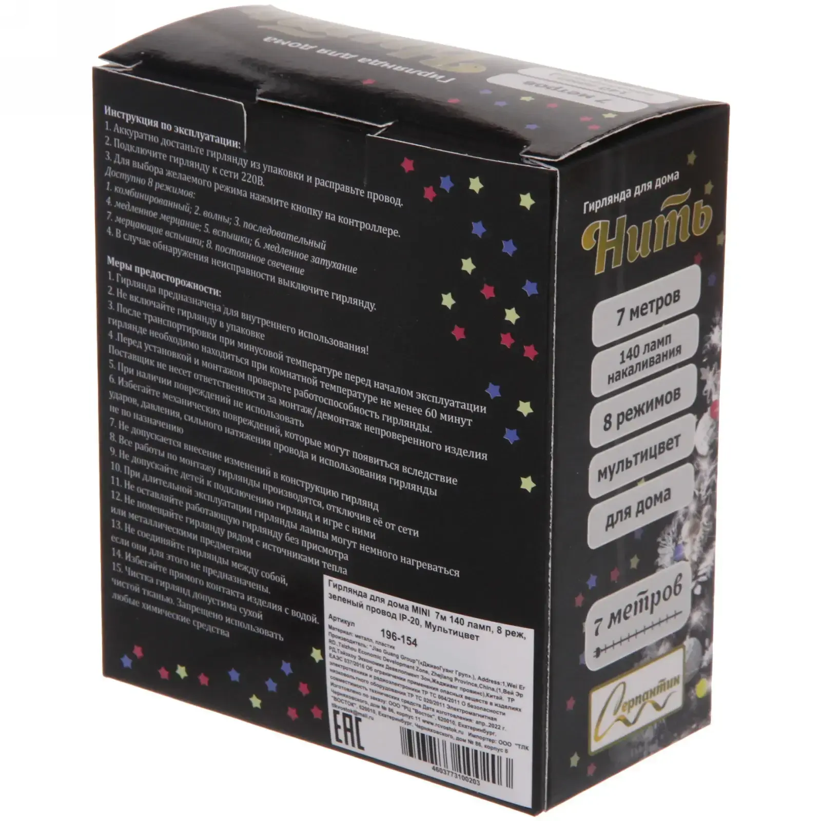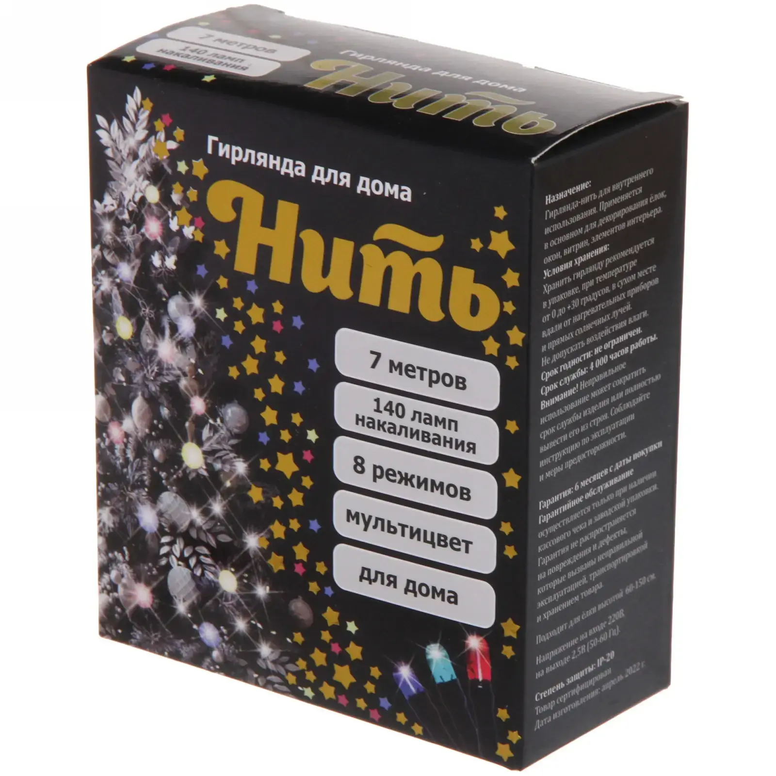 Гирлянда имеет длину 7 метров и состоит из 140 ламп, что обеспечивает равномерное распределение света. Она работает от сети и имеет удобный контроллер для выбора режимов. Провод выполнен из качественного материала, что обеспечивает надежность и безопасность использования. Не упустите возможность сделать ваш дом более уютным и красивым с гирляндой 'Нить'!