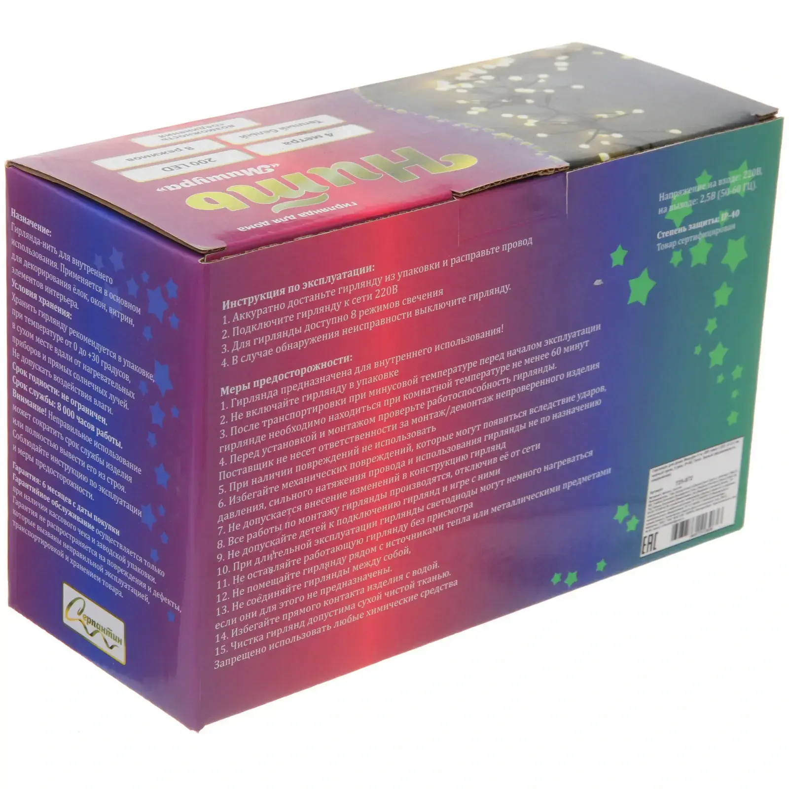 Гирлянда имеет диаметр лампочек 1,4 см и защищена по стандарту IP-40, что делает ее безопасной для использования в помещениях. Убедитесь, что вы используете гирлянду в соответствии с инструкциями, чтобы продлить срок ее службы. Не упустите возможность добавить яркие акценты в ваш дом с помощью этой стильной гирлянды!