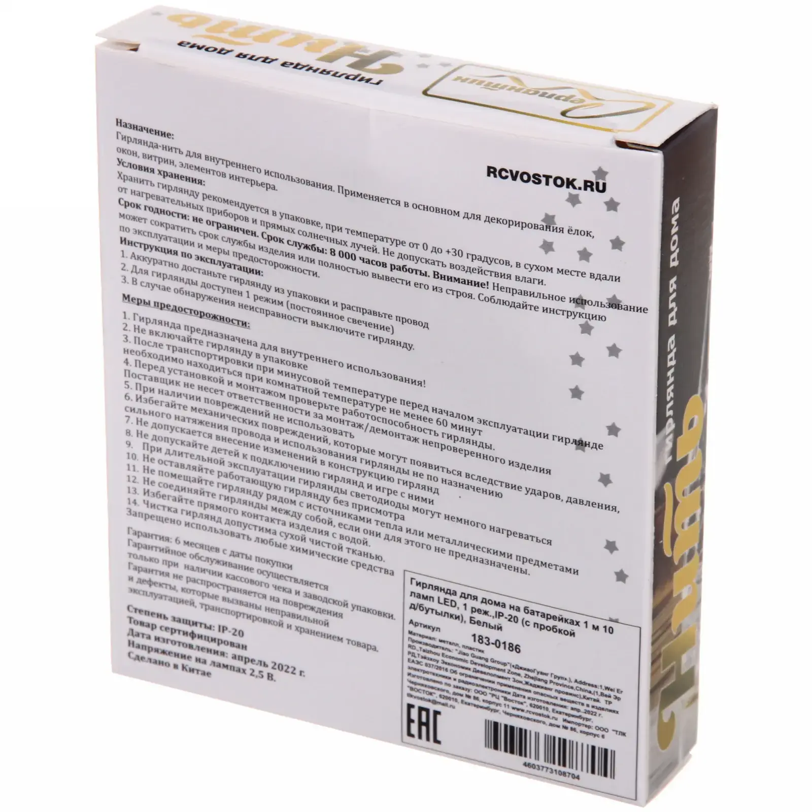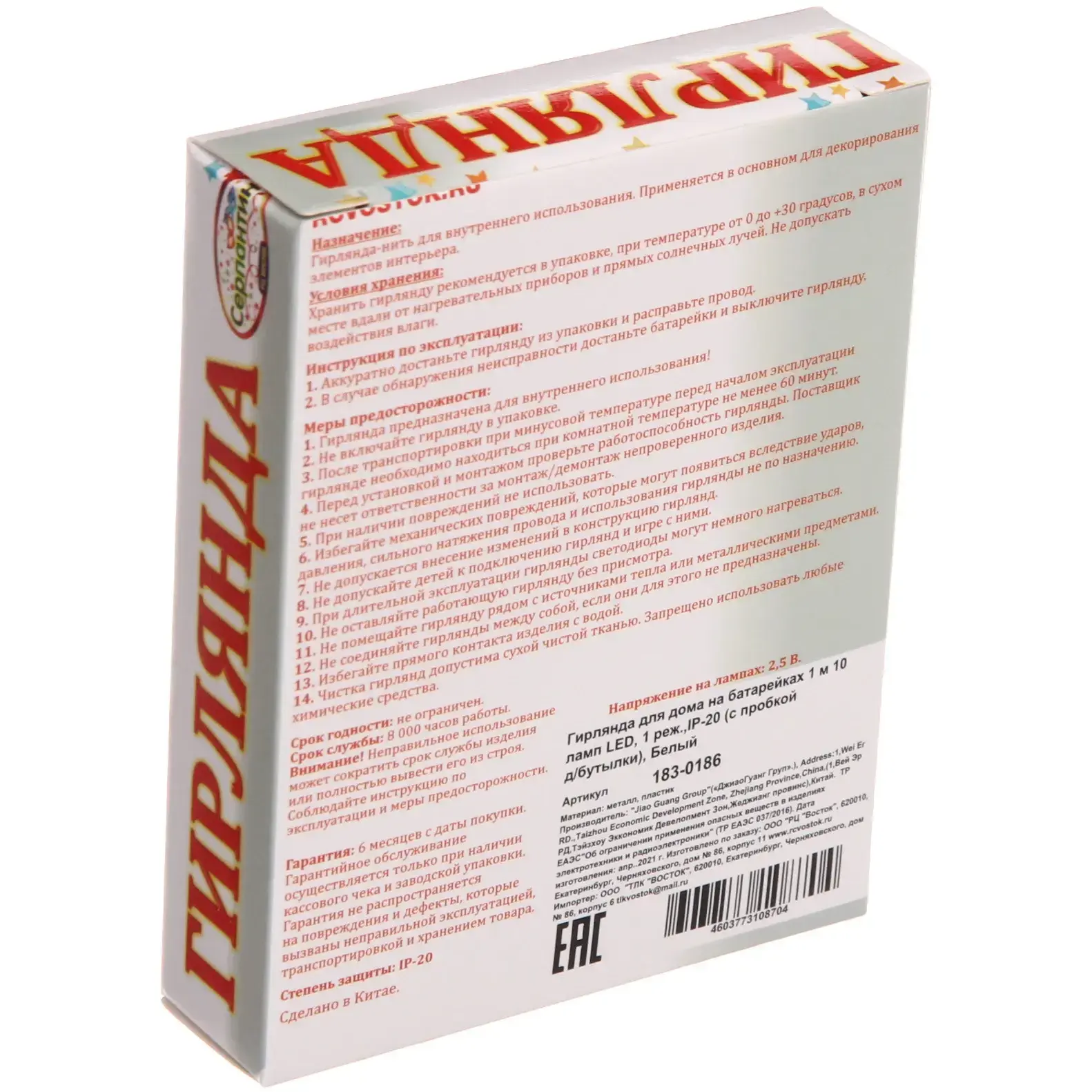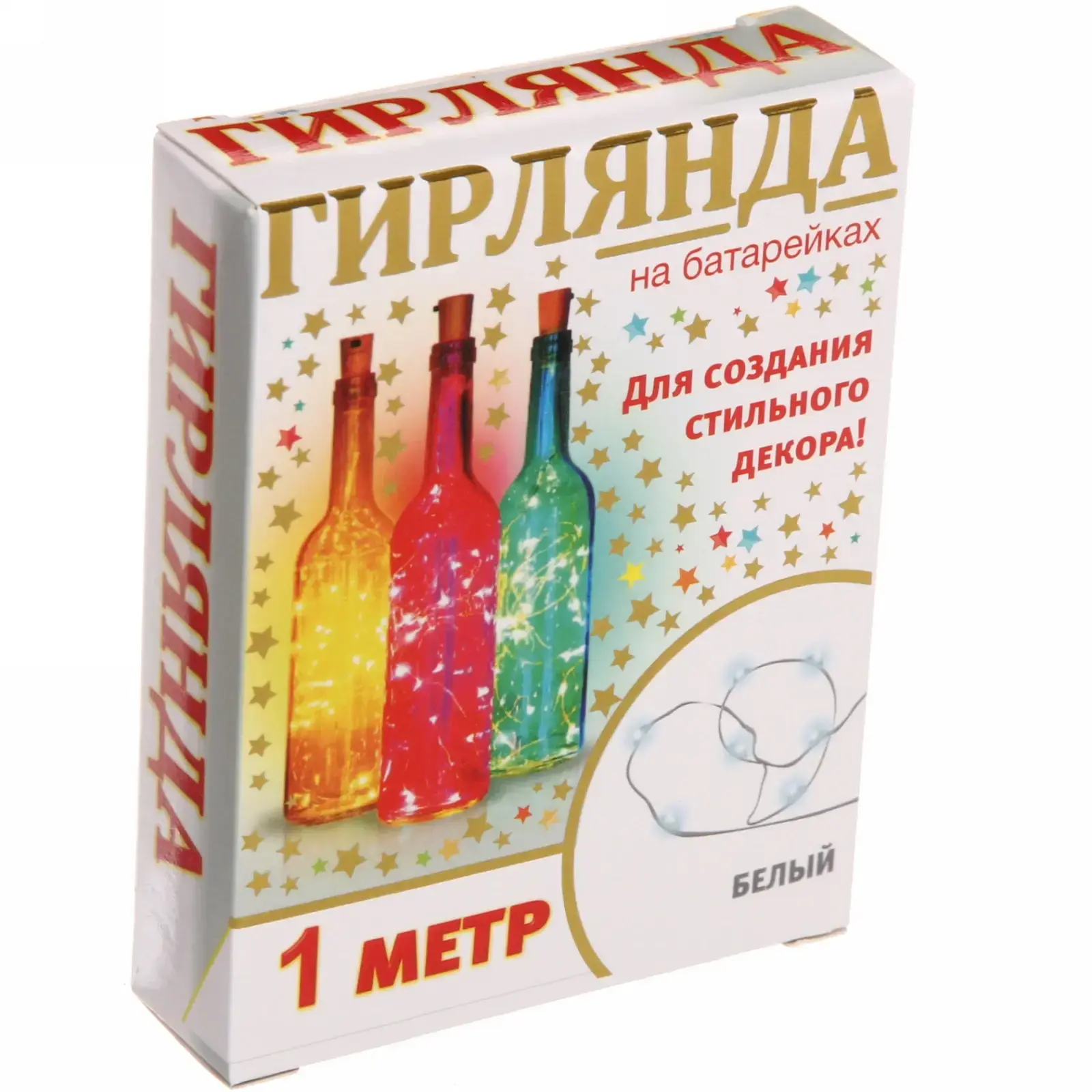 Гирлянда для дома на батарейках 1 м 10 ламп LED, 1 реж.,IP-20 (с пробкой д/бутылки), Белый