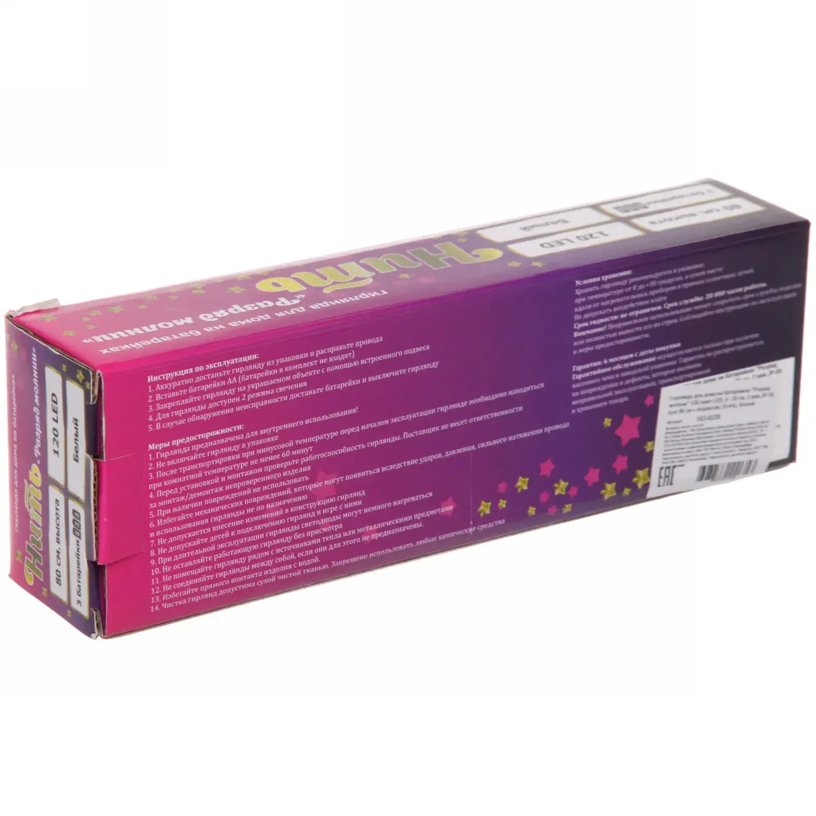 Гирлянда работает от 3 батареек типа AA, что делает её удобной для использования в любом месте, где нет доступа к электросети. Она идеально подходит для декорирования интерьеров, фасадов зданий, а также для создания праздничного настроения на мероприятиях. Два режима работы позволяют вам выбрать между постоянным светом и мерцанием, что добавляет разнообразия в оформление.