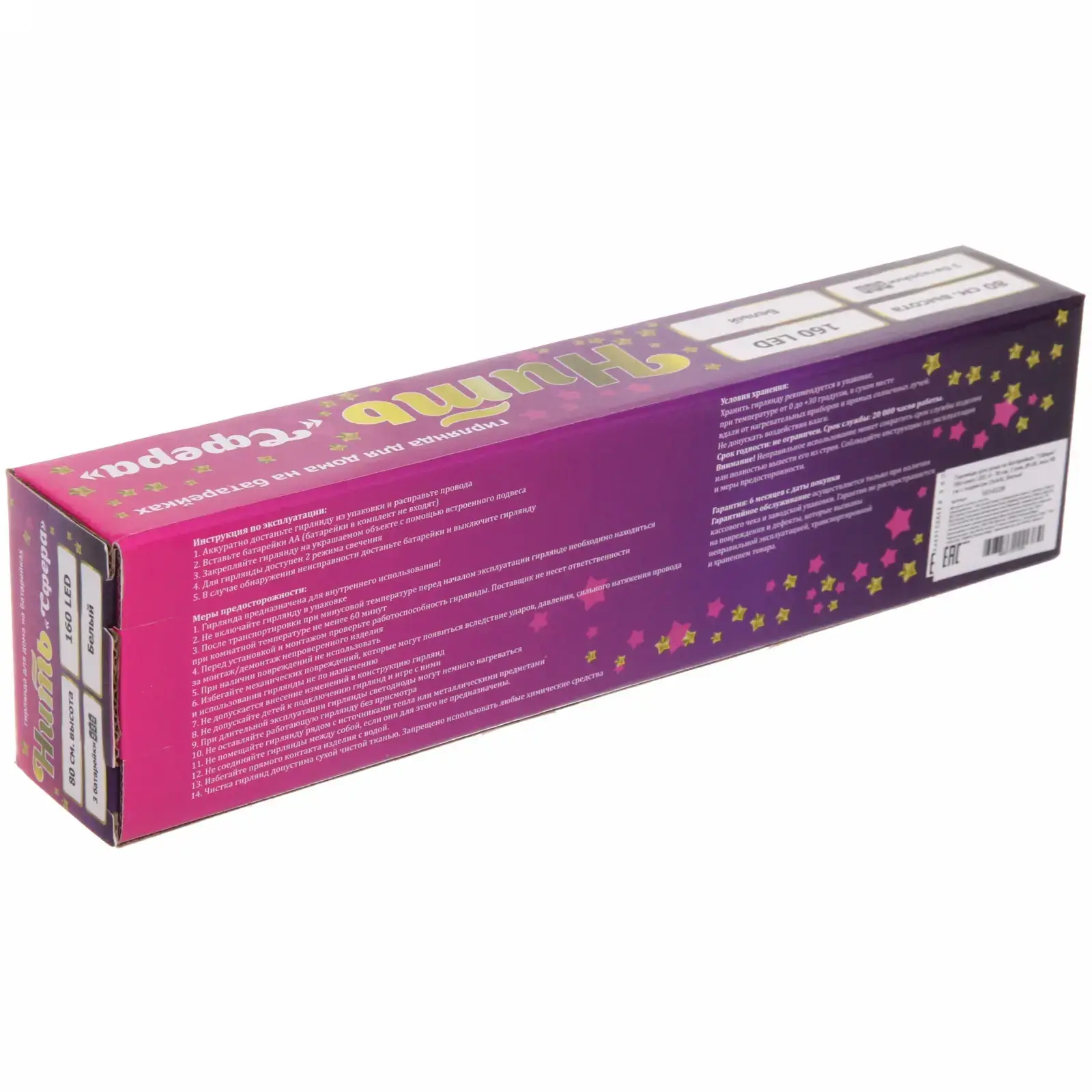 Светодиодная технология гарантирует минимальное энергопотребление — до 100 часов непрерывной работы от одного комплекта элементов питания. Устойчивое крепление с продуманным крючком обеспечивает надежную фиксацию на ветвях, карнизах или текстильных поверхностях.