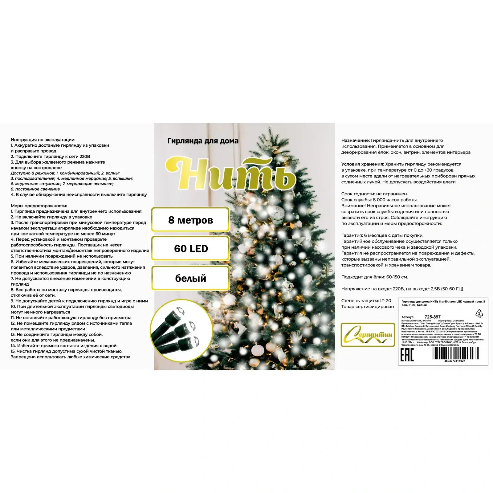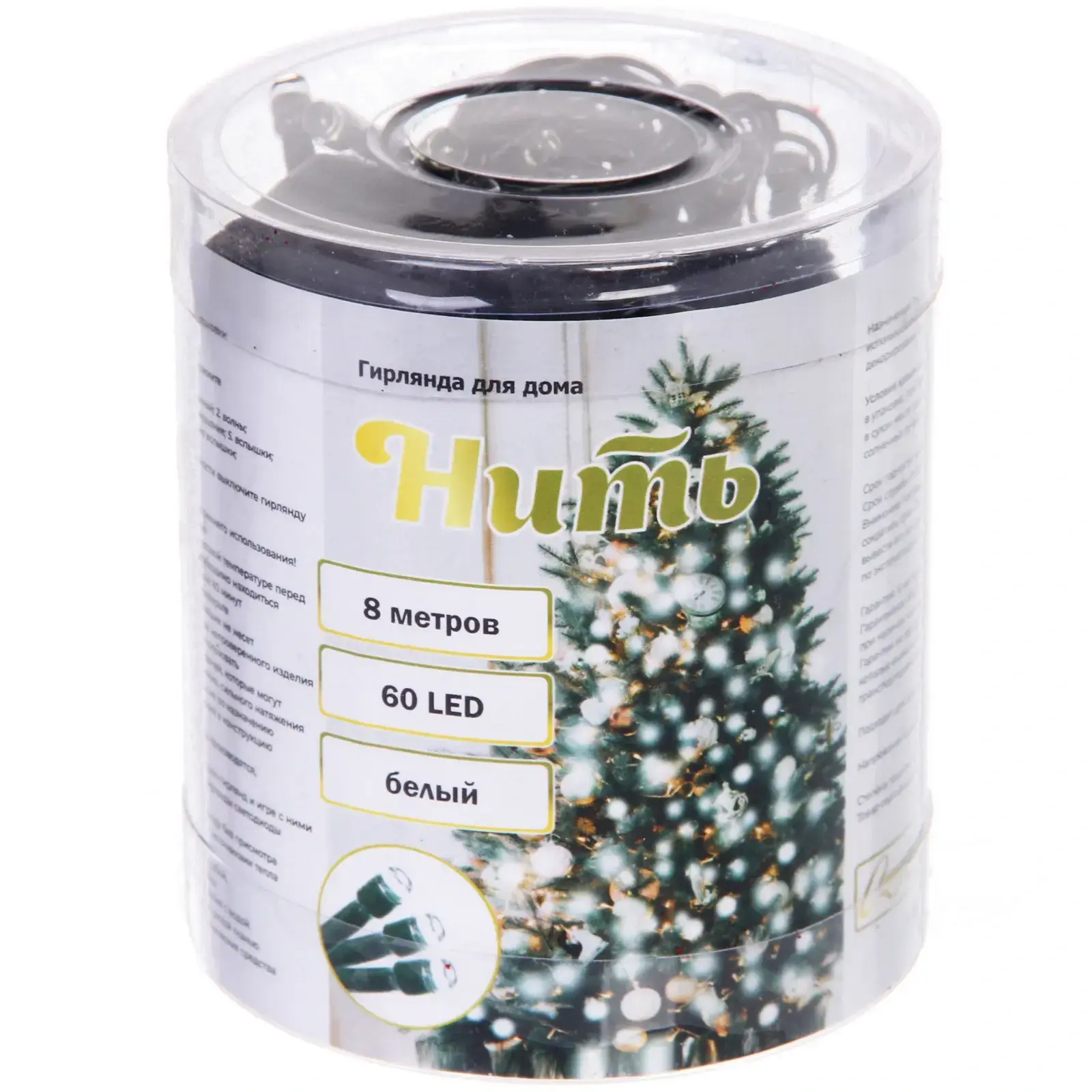 Гирлянда для дома НИТЬ 8 м 60 ламп LED черный пров.,8 реж, IP-20, Белый