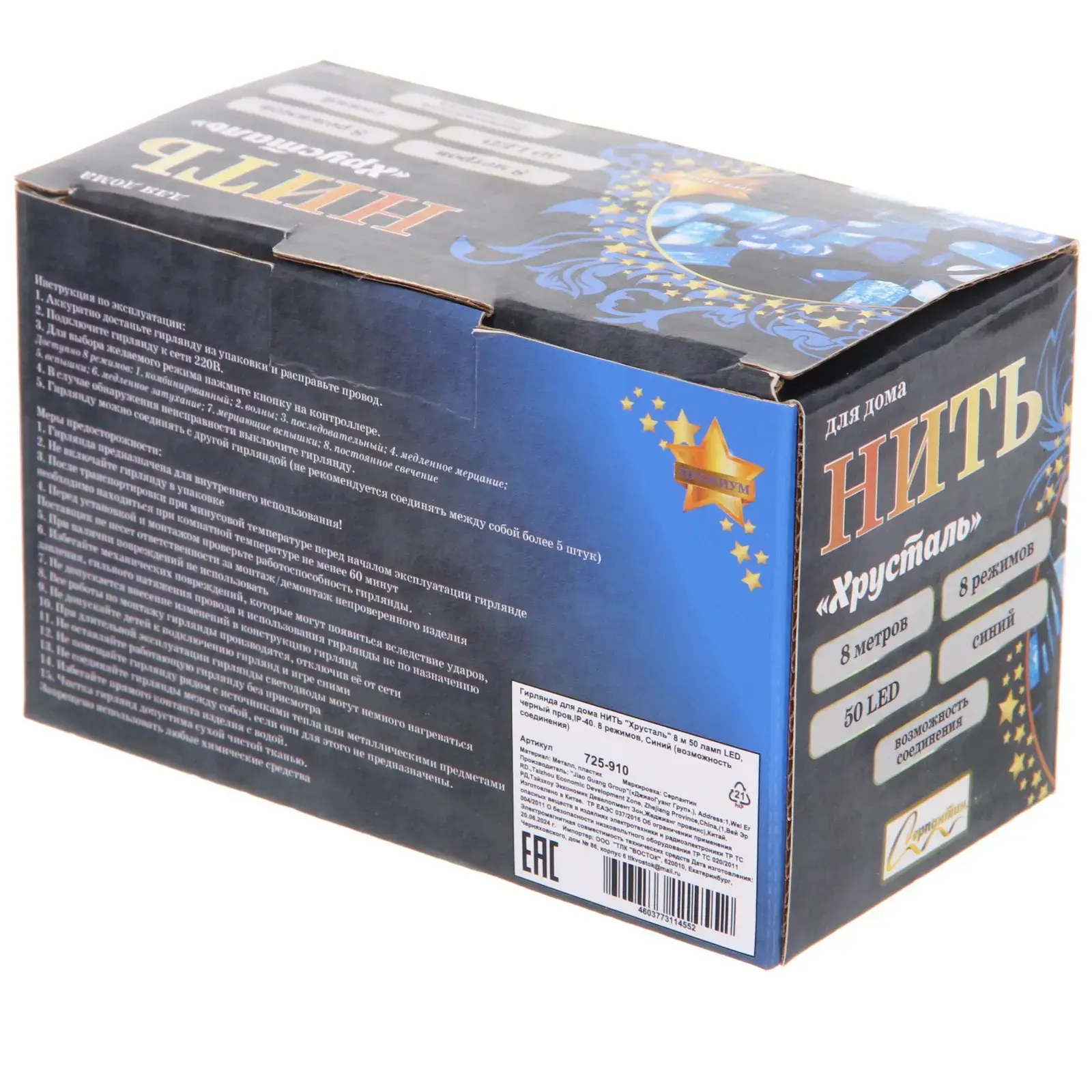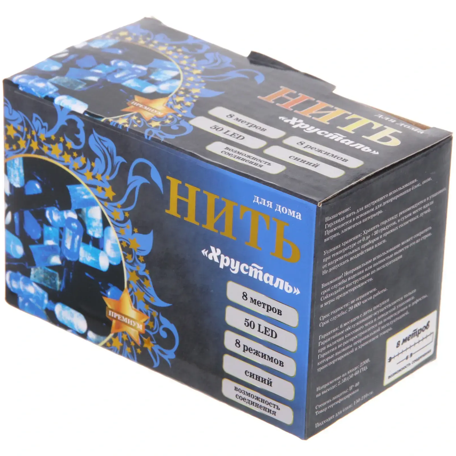 Гирлянда для дома НИТЬ «Хрусталь» 8 м 50 ламп LED, черный пров,IP-40. 8 режимов, Синий (возможность соединения)